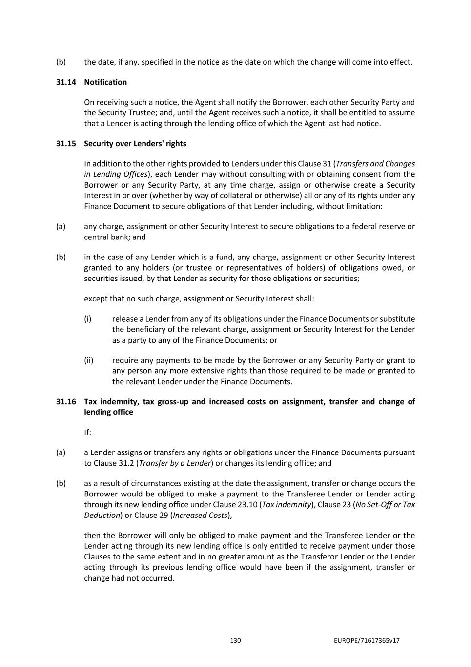 130 EUROPE/71617365v17 (b) the date, if any, specified in the notice as the date on which the change will come into effect. 31.14 Notification On receiving such a notice, the Agent shall notify the Borrower, each other Security Party and the Security Trustee; and, until the Agent receives such a notice, it shall be entitled to assume that a Lender is acting through the lending office of which the Agent last had notice. 31.15 Security over Lenders' rights In addition to the other rights provided to Lenders under this Clause 31 (Transfers and Changes in Lending Offices), each Lender may without consulting with or obtaining consent from the Borrower or any Security Party, at any time charge, assign or otherwise create a Security Interest in or over (whether by way of collateral or otherwise) all or any of its rights under any Finance Document to secure obligations of that Lender including, without limitation: (a) any charge, assignment or other Security Interest to secure obligations to a federal reserve or central bank; and (b) in the case of any Lender which is a fund, any charge, assignment or other Security Interest granted to any holders (or trustee or representatives of holders) of obligations owed, or securities issued, by that Lender as security for those obligations or securities; except that no such charge, assignment or Security Interest shall: (i) release a Lender from any of its obligations under the Finance Documents or substitute the beneficiary of the relevant charge, assignment or Security Interest for the Lender as a party to any of the Finance Documents; or (ii) require any payments to be made by the Borrower or any Security Party or grant to any person any more extensive rights than those required to be made or granted to the relevant Lender under the Finance Documents. 31.16 Tax indemnity, tax gross-up and increased costs on assignment, transfer and change of lending office If: (a) a Lender assigns or transfers any rights or obligations under the Finance Documents pursuant to Clause 31.2 (Transfer by a Lender) or changes its lending office; and (b) as a result of circumstances existing at the date the assignment, transfer or change occurs the Borrower would be obliged to make a payment to the Transferee Lender or Lender acting through its new lending office under Clause 23.10 (Tax indemnity), Clause 23 (No Set-Off or Tax Deduction) or Clause 29 (Increased Costs), then the Borrower will only be obliged to make payment and the Transferee Lender or the Lender acting through its new lending office is only entitled to receive payment under those Clauses to the same extent and in no greater amount as the Transferor Lender or the Lender acting through its previous lending office would have been if the assignment, transfer or change had not occurred.