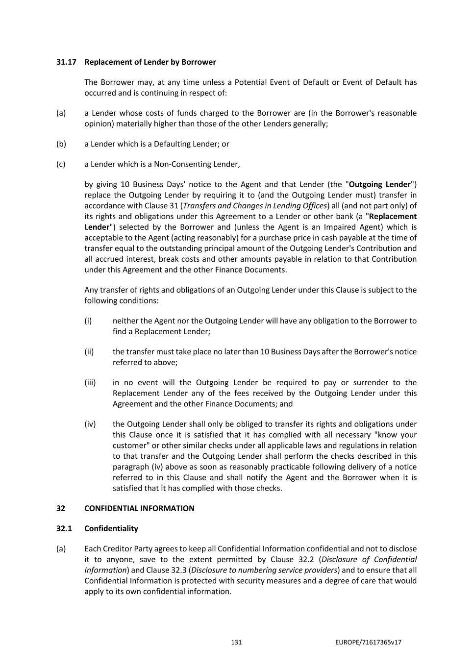 131 EUROPE/71617365v17 31.17 Replacement of Lender by Borrower The Borrower may, at any time unless a Potential Event of Default or Event of Default has occurred and is continuing in respect of: (a) a Lender whose costs of funds charged to the Borrower are (in the Borrower's reasonable opinion) materially higher than those of the other Lenders generally; (b) a Lender which is a Defaulting Lender; or (c) a Lender which is a Non-Consenting Lender, by giving 10 Business Days' notice to the Agent and that Lender (the "Outgoing Lender") replace the Outgoing Lender by requiring it to (and the Outgoing Lender must) transfer in accordance with Clause 31 (Transfers and Changes in Lending Offices) all (and not part only) of its rights and obligations under this Agreement to a Lender or other bank (a "Replacement Lender") selected by the Borrower and (unless the Agent is an Impaired Agent) which is acceptable to the Agent (acting reasonably) for a purchase price in cash payable at the time of transfer equal to the outstanding principal amount of the Outgoing Lender's Contribution and all accrued interest, break costs and other amounts payable in relation to that Contribution under this Agreement and the other Finance Documents. Any transfer of rights and obligations of an Outgoing Lender under this Clause is subject to the following conditions: (i) neither the Agent nor the Outgoing Lender will have any obligation to the Borrower to find a Replacement Lender; (ii) the transfer must take place no later than 10 Business Days after the Borrower's notice referred to above; (iii) in no event will the Outgoing Lender be required to pay or surrender to the Replacement Lender any of the fees received by the Outgoing Lender under this Agreement and the other Finance Documents; and (iv) the Outgoing Lender shall only be obliged to transfer its rights and obligations under this Clause once it is satisfied that it has complied with all necessary "know your customer" or other similar checks under all applicable laws and regulations in relation to that transfer and the Outgoing Lender shall perform the checks described in this paragraph (iv) above as soon as reasonably practicable following delivery of a notice referred to in this Clause and shall notify the Agent and the Borrower when it is satisfied that it has complied with those checks. 32 CONFIDENTIAL INFORMATION 32.1 Confidentiality (a) Each Creditor Party agrees to keep all Confidential Information confidential and not to disclose it to anyone, save to the extent permitted by Clause 32.2 (Disclosure of Confidential Information) and Clause 32.3 (Disclosure to numbering service providers) and to ensure that all Confidential Information is protected with security measures and a degree of care that would apply to its own confidential information.