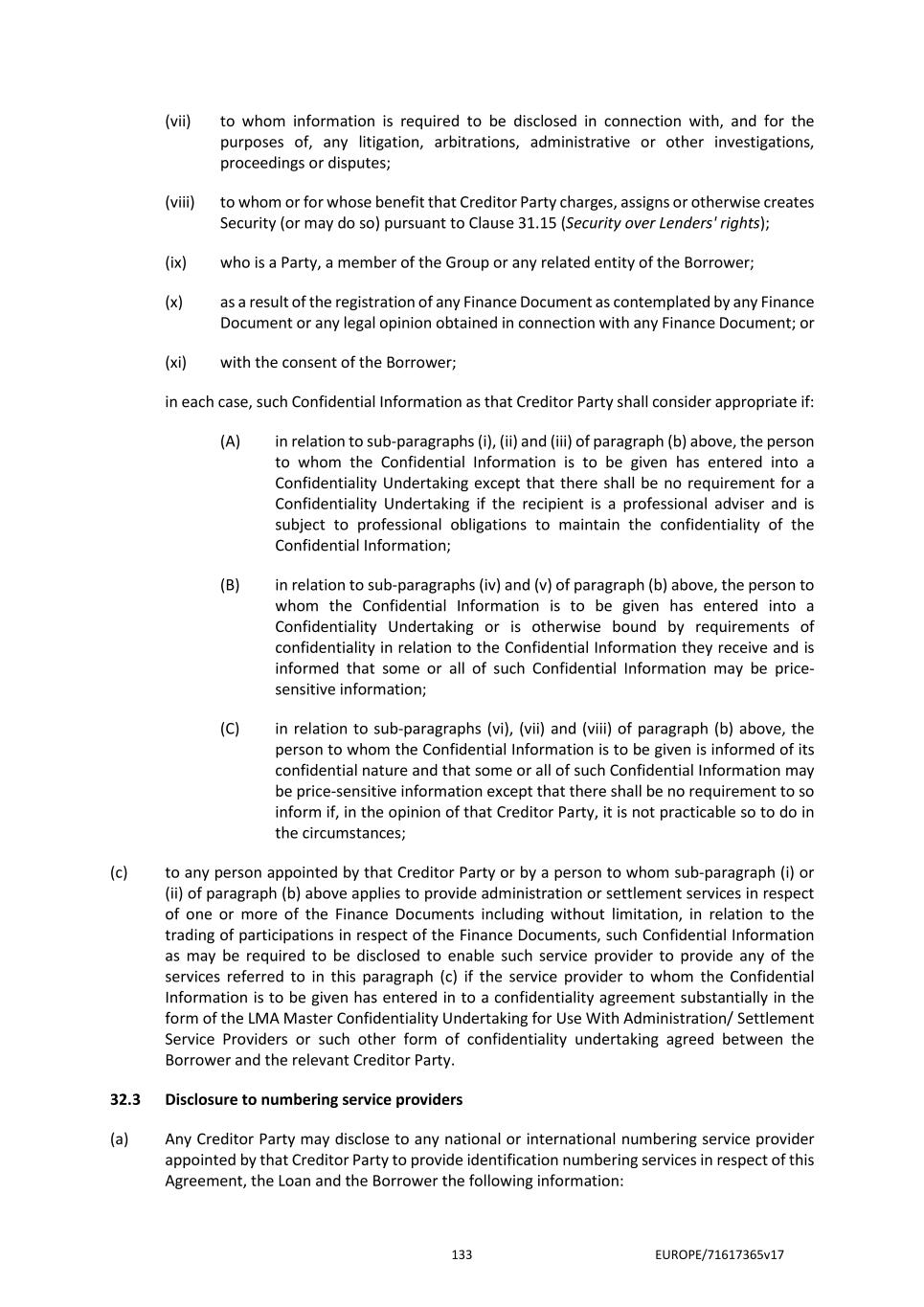 133 EUROPE/71617365v17 (vii) to whom information is required to be disclosed in connection with, and for the purposes of, any litigation, arbitrations, administrative or other investigations, proceedings or disputes; (viii) to whom or for whose benefit that Creditor Party charges, assigns or otherwise creates Security (or may do so) pursuant to Clause 31.15 (Security over Lenders' rights); (ix) who is a Party, a member of the Group or any related entity of the Borrower; (x) as a result of the registration of any Finance Document as contemplated by any Finance Document or any legal opinion obtained in connection with any Finance Document; or (xi) with the consent of the Borrower; in each case, such Confidential Information as that Creditor Party shall consider appropriate if: (A) in relation to sub-paragraphs (i), (ii) and (iii) of paragraph (b) above, the person to whom the Confidential Information is to be given has entered into a Confidentiality Undertaking except that there shall be no requirement for a Confidentiality Undertaking if the recipient is a professional adviser and is subject to professional obligations to maintain the confidentiality of the Confidential Information; (B) in relation to sub-paragraphs (iv) and (v) of paragraph (b) above, the person to whom the Confidential Information is to be given has entered into a Confidentiality Undertaking or is otherwise bound by requirements of confidentiality in relation to the Confidential Information they receive and is informed that some or all of such Confidential Information may be price- sensitive information; (C) in relation to sub-paragraphs (vi), (vii) and (viii) of paragraph (b) above, the person to whom the Confidential Information is to be given is informed of its confidential nature and that some or all of such Confidential Information may be price-sensitive information except that there shall be no requirement to so inform if, in the opinion of that Creditor Party, it is not practicable so to do in the circumstances; (c) to any person appointed by that Creditor Party or by a person to whom sub-paragraph (i) or (ii) of paragraph (b) above applies to provide administration or settlement services in respect of one or more of the Finance Documents including without limitation, in relation to the trading of participations in respect of the Finance Documents, such Confidential Information as may be required to be disclosed to enable such service provider to provide any of the services referred to in this paragraph (c) if the service provider to whom the Confidential Information is to be given has entered in to a confidentiality agreement substantially in the form of the LMA Master Confidentiality Undertaking for Use With Administration/ Settlement Service Providers or such other form of confidentiality undertaking agreed between the Borrower and the relevant Creditor Party. 32.3 Disclosure to numbering service providers (a) Any Creditor Party may disclose to any national or international numbering service provider appointed by that Creditor Party to provide identification numbering services in respect of this Agreement, the Loan and the Borrower the following information:
