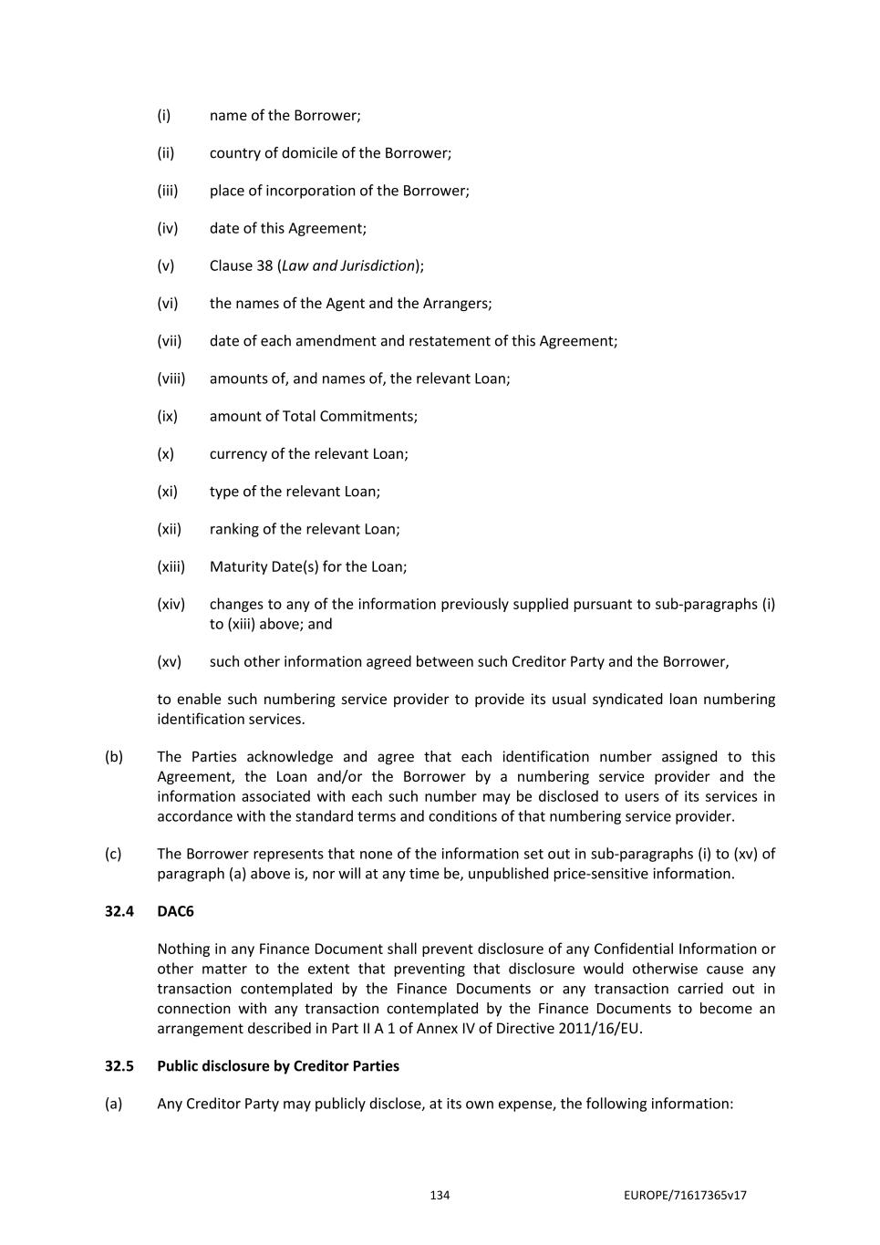 134 EUROPE/71617365v17 (i) name of the Borrower; (ii) country of domicile of the Borrower; (iii) place of incorporation of the Borrower; (iv) date of this Agreement; (v) Clause 38 (Law and Jurisdiction); (vi) the names of the Agent and the Arrangers; (vii) date of each amendment and restatement of this Agreement; (viii) amounts of, and names of, the relevant Loan; (ix) amount of Total Commitments; (x) currency of the relevant Loan; (xi) type of the relevant Loan; (xii) ranking of the relevant Loan; (xiii) Maturity Date(s) for the Loan; (xiv) changes to any of the information previously supplied pursuant to sub-paragraphs (i) to (xiii) above; and (xv) such other information agreed between such Creditor Party and the Borrower, to enable such numbering service provider to provide its usual syndicated loan numbering identification services. (b) The Parties acknowledge and agree that each identification number assigned to this Agreement, the Loan and/or the Borrower by a numbering service provider and the information associated with each such number may be disclosed to users of its services in accordance with the standard terms and conditions of that numbering service provider. (c) The Borrower represents that none of the information set out in sub-paragraphs (i) to (xv) of paragraph (a) above is, nor will at any time be, unpublished price-sensitive information. 32.4 DAC6 Nothing in any Finance Document shall prevent disclosure of any Confidential Information or other matter to the extent that preventing that disclosure would otherwise cause any transaction contemplated by the Finance Documents or any transaction carried out in connection with any transaction contemplated by the Finance Documents to become an arrangement described in Part II A 1 of Annex IV of Directive 2011/16/EU. 32.5 Public disclosure by Creditor Parties (a) Any Creditor Party may publicly disclose, at its own expense, the following information: