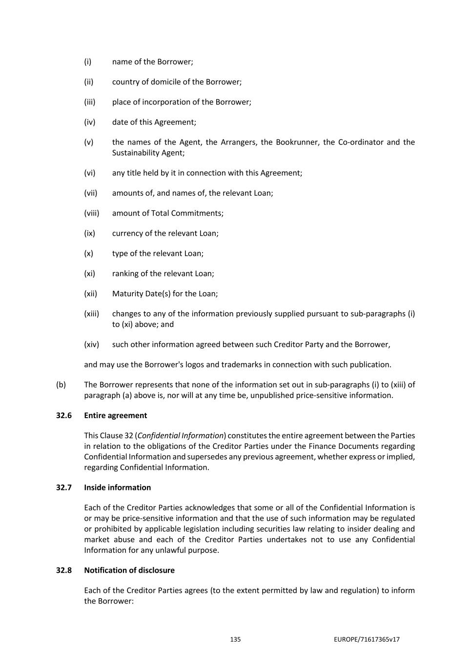 135 EUROPE/71617365v17 (i) name of the Borrower; (ii) country of domicile of the Borrower; (iii) place of incorporation of the Borrower; (iv) date of this Agreement; (v) the names of the Agent, the Arrangers, the Bookrunner, the Co-ordinator and the Sustainability Agent; (vi) any title held by it in connection with this Agreement; (vii) amounts of, and names of, the relevant Loan; (viii) amount of Total Commitments; (ix) currency of the relevant Loan; (x) type of the relevant Loan; (xi) ranking of the relevant Loan; (xii) Maturity Date(s) for the Loan; (xiii) changes to any of the information previously supplied pursuant to sub-paragraphs (i) to (xi) above; and (xiv) such other information agreed between such Creditor Party and the Borrower, and may use the Borrower's logos and trademarks in connection with such publication. (b) The Borrower represents that none of the information set out in sub-paragraphs (i) to (xiii) of paragraph (a) above is, nor will at any time be, unpublished price-sensitive information. 32.6 Entire agreement This Clause 32 (Confidential Information) constitutes the entire agreement between the Parties in relation to the obligations of the Creditor Parties under the Finance Documents regarding Confidential Information and supersedes any previous agreement, whether express or implied, regarding Confidential Information. 32.7 Inside information Each of the Creditor Parties acknowledges that some or all of the Confidential Information is or may be price-sensitive information and that the use of such information may be regulated or prohibited by applicable legislation including securities law relating to insider dealing and market abuse and each of the Creditor Parties undertakes not to use any Confidential Information for any unlawful purpose. 32.8 Notification of disclosure Each of the Creditor Parties agrees (to the extent permitted by law and regulation) to inform the Borrower: