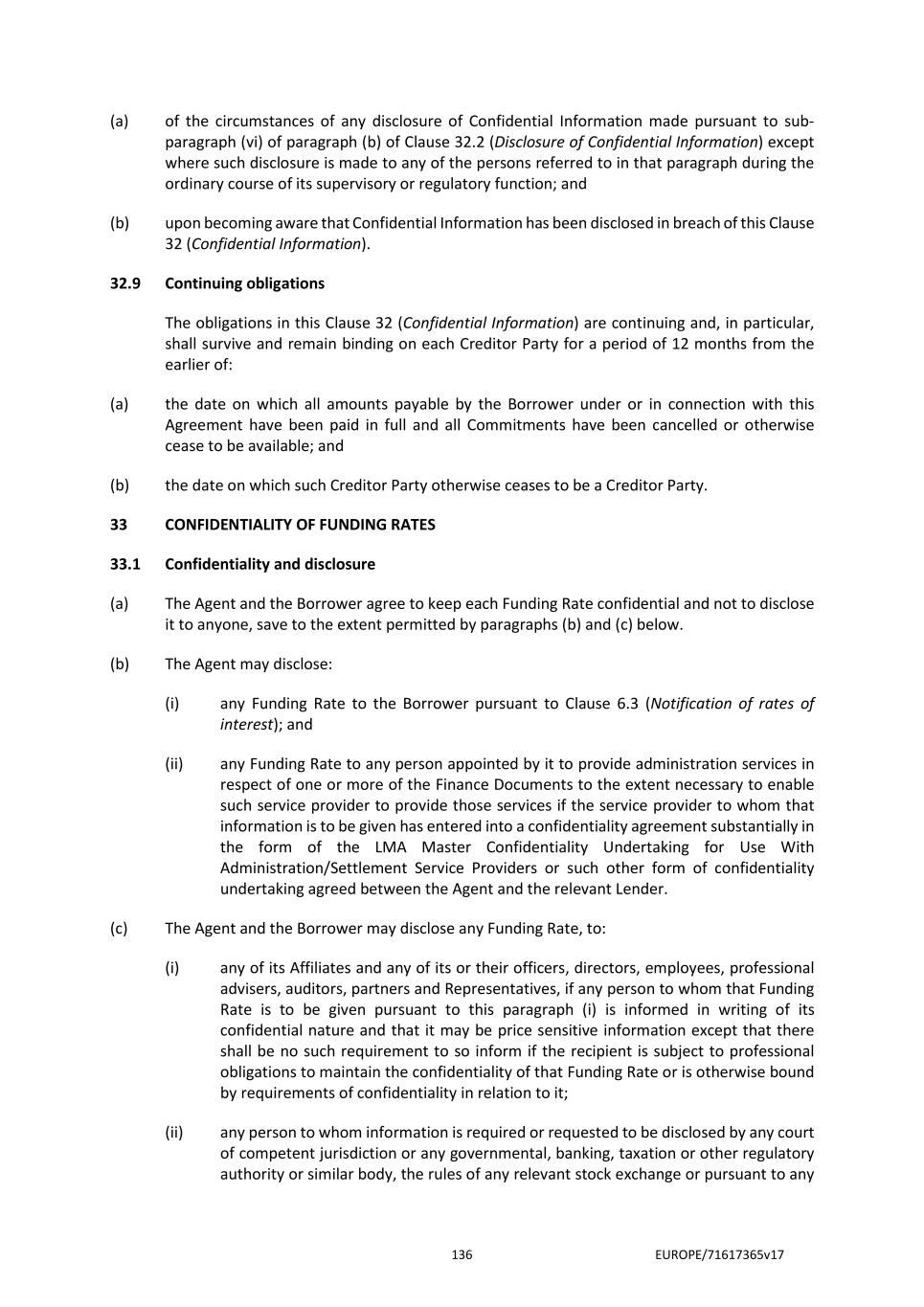 136 EUROPE/71617365v17 (a) of the circumstances of any disclosure of Confidential Information made pursuant to sub- paragraph (vi) of paragraph (b) of Clause 32.2 (Disclosure of Confidential Information) except where such disclosure is made to any of the persons referred to in that paragraph during the ordinary course of its supervisory or regulatory function; and (b) upon becoming aware that Confidential Information has been disclosed in breach of this Clause 32 (Confidential Information). 32.9 Continuing obligations The obligations in this Clause 32 (Confidential Information) are continuing and, in particular, shall survive and remain binding on each Creditor Party for a period of 12 months from the earlier of: (a) the date on which all amounts payable by the Borrower under or in connection with this Agreement have been paid in full and all Commitments have been cancelled or otherwise cease to be available; and (b) the date on which such Creditor Party otherwise ceases to be a Creditor Party. 33 CONFIDENTIALITY OF FUNDING RATES 33.1 Confidentiality and disclosure (a) The Agent and the Borrower agree to keep each Funding Rate confidential and not to disclose it to anyone, save to the extent permitted by paragraphs (b) and (c) below. (b) The Agent may disclose: (i) any Funding Rate to the Borrower pursuant to Clause 6.3 (Notification of rates of interest); and (ii) any Funding Rate to any person appointed by it to provide administration services in respect of one or more of the Finance Documents to the extent necessary to enable such service provider to provide those services if the service provider to whom that information is to be given has entered into a confidentiality agreement substantially in the form of the LMA Master Confidentiality Undertaking for Use With Administration/Settlement Service Providers or such other form of confidentiality undertaking agreed between the Agent and the relevant Lender. (c) The Agent and the Borrower may disclose any Funding Rate, to: (i) any of its Affiliates and any of its or their officers, directors, employees, professional advisers, auditors, partners and Representatives, if any person to whom that Funding Rate is to be given pursuant to this paragraph (i) is informed in writing of its confidential nature and that it may be price sensitive information except that there shall be no such requirement to so inform if the recipient is subject to professional obligations to maintain the confidentiality of that Funding Rate or is otherwise bound by requirements of confidentiality in relation to it; (ii) any person to whom information is required or requested to be disclosed by any court of competent jurisdiction or any governmental, banking, taxation or other regulatory authority or similar body, the rules of any relevant stock exchange or pursuant to any