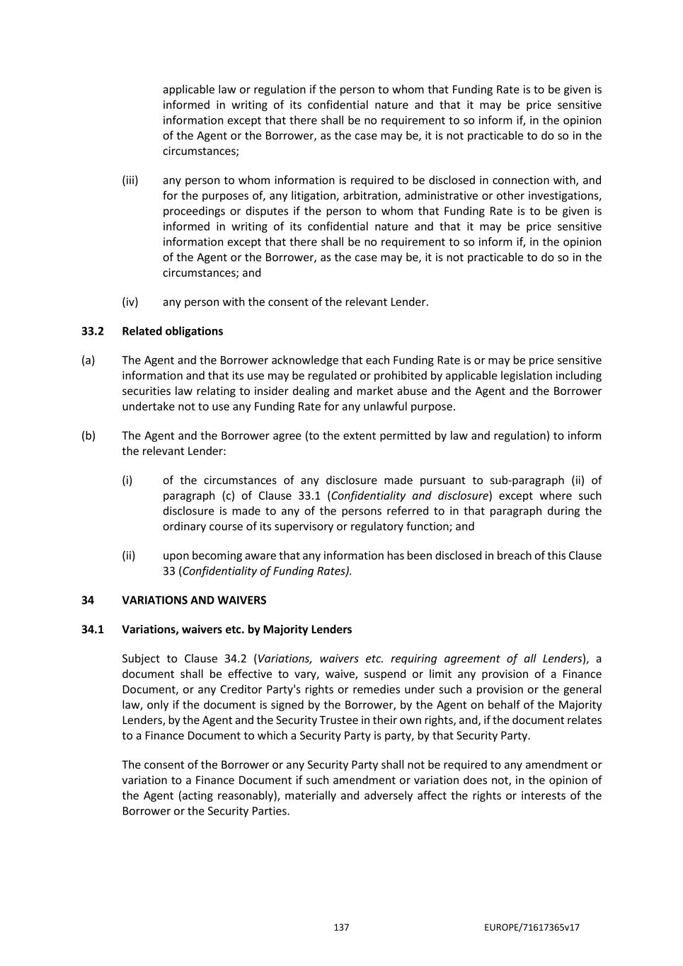 137 EUROPE/71617365v17 applicable law or regulation if the person to whom that Funding Rate is to be given is informed in writing of its confidential nature and that it may be price sensitive information except that there shall be no requirement to so inform if, in the opinion of the Agent or the Borrower, as the case may be, it is not practicable to do so in the circumstances; (iii) any person to whom information is required to be disclosed in connection with, and for the purposes of, any litigation, arbitration, administrative or other investigations, proceedings or disputes if the person to whom that Funding Rate is to be given is informed in writing of its confidential nature and that it may be price sensitive information except that there shall be no requirement to so inform if, in the opinion of the Agent or the Borrower, as the case may be, it is not practicable to do so in the circumstances; and (iv) any person with the consent of the relevant Lender. 33.2 Related obligations (a) The Agent and the Borrower acknowledge that each Funding Rate is or may be price sensitive information and that its use may be regulated or prohibited by applicable legislation including securities law relating to insider dealing and market abuse and the Agent and the Borrower undertake not to use any Funding Rate for any unlawful purpose. (b) The Agent and the Borrower agree (to the extent permitted by law and regulation) to inform the relevant Lender: (i) of the circumstances of any disclosure made pursuant to sub-paragraph (ii) of paragraph (c) of Clause 33.1 (Confidentiality and disclosure) except where such disclosure is made to any of the persons referred to in that paragraph during the ordinary course of its supervisory or regulatory function; and (ii) upon becoming aware that any information has been disclosed in breach of this Clause 33 (Confidentiality of Funding Rates). 34 VARIATIONS AND WAIVERS 34.1 Variations, waivers etc. by Majority Lenders Subject to Clause 34.2 (Variations, waivers etc. requiring agreement of all Lenders), a document shall be effective to vary, waive, suspend or limit any provision of a Finance Document, or any Creditor Party's rights or remedies under such a provision or the general law, only if the document is signed by the Borrower, by the Agent on behalf of the Majority Lenders, by the Agent and the Security Trustee in their own rights, and, if the document relates to a Finance Document to which a Security Party is party, by that Security Party. The consent of the Borrower or any Security Party shall not be required to any amendment or variation to a Finance Document if such amendment or variation does not, in the opinion of the Agent (acting reasonably), materially and adversely affect the rights or interests of the Borrower or the Security Parties.