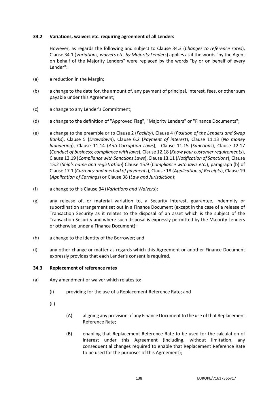 138 EUROPE/71617365v17 34.2 Variations, waivers etc. requiring agreement of all Lenders However, as regards the following and subject to Clause 34.3 (Changes to reference rates), Clause 34.1 (Variations, waivers etc. by Majority Lenders) applies as if the words "by the Agent on behalf of the Majority Lenders" were replaced by the words "by or on behalf of every Lender": (a) a reduction in the Margin; (b) a change to the date for, the amount of, any payment of principal, interest, fees, or other sum payable under this Agreement; (c) a change to any Lender's Commitment; (d) a change to the definition of "Approved Flag", "Majority Lenders" or "Finance Documents"; (e) a change to the preamble or to Clause 2 (Facility), Clause 4 (Position of the Lenders and Swap Banks), Clause 5 (Drawdown), Clause 6.2 (Payment of interest), Clause 11.13 (No money laundering), Clause 11.14 (Anti-Corruption Laws), Clause 11.15 (Sanctions), Clause 12.17 (Conduct of business; compliance with laws), Clause 12.18 (Know your customer requirements), Clause 12.19 (Compliance with Sanctions Laws), Clause 13.11 (Notification of Sanctions), Clause 15.2 (Ship's name and registration) Clause 15.9 (Compliance with laws etc.), paragraph (b) of Clause 17.1 (Currency and method of payments), Clause 18 (Application of Receipts), Clause 19 (Application of Earnings) or Clause 38 (Law and Jurisdiction); (f) a change to this Clause 34 (Variations and Waivers); (g) any release of, or material variation to, a Security Interest, guarantee, indemnity or subordination arrangement set out in a Finance Document (except in the case of a release of Transaction Security as it relates to the disposal of an asset which is the subject of the Transaction Security and where such disposal is expressly permitted by the Majority Lenders or otherwise under a Finance Document); (h) a change to the identity of the Borrower; and (i) any other change or matter as regards which this Agreement or another Finance Document expressly provides that each Lender's consent is required. 34.3 Replacement of reference rates (a) Any amendment or waiver which relates to: (i) providing for the use of a Replacement Reference Rate; and (ii) (A) aligning any provision of any Finance Document to the use of that Replacement Reference Rate; (B) enabling that Replacement Reference Rate to be used for the calculation of interest under this Agreement (including, without limitation, any consequential changes required to enable that Replacement Reference Rate to be used for the purposes of this Agreement);