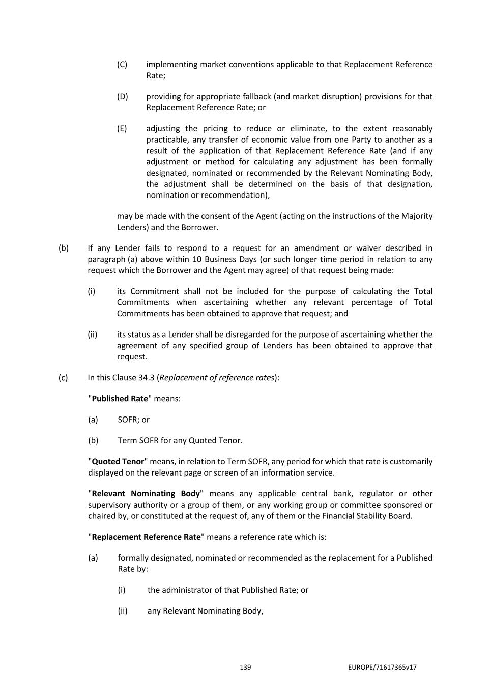 139 EUROPE/71617365v17 (C) implementing market conventions applicable to that Replacement Reference Rate; (D) providing for appropriate fallback (and market disruption) provisions for that Replacement Reference Rate; or (E) adjusting the pricing to reduce or eliminate, to the extent reasonably practicable, any transfer of economic value from one Party to another as a result of the application of that Replacement Reference Rate (and if any adjustment or method for calculating any adjustment has been formally designated, nominated or recommended by the Relevant Nominating Body, the adjustment shall be determined on the basis of that designation, nomination or recommendation), may be made with the consent of the Agent (acting on the instructions of the Majority Lenders) and the Borrower. (b) If any Lender fails to respond to a request for an amendment or waiver described in paragraph (a) above within 10 Business Days (or such longer time period in relation to any request which the Borrower and the Agent may agree) of that request being made: (i) its Commitment shall not be included for the purpose of calculating the Total Commitments when ascertaining whether any relevant percentage of Total Commitments has been obtained to approve that request; and (ii) its status as a Lender shall be disregarded for the purpose of ascertaining whether the agreement of any specified group of Lenders has been obtained to approve that request. In this Clause 34.3 (Replacement of reference rates): "Published Rate" means: (a) SOFR; or (b) Term SOFR for any Quoted Tenor. "Quoted Tenor" means, in relation to Term SOFR, any period for which that rate is customarily displayed on the relevant page or screen of an information service. "Relevant Nominating Body" means any applicable central bank, regulator or other supervisory authority or a group of them, or any working group or committee sponsored or chaired by, or constituted at the request of, any of them or the Financial Stability Board. "Replacement Reference Rate" means a reference rate which is: (a) formally designated, nominated or recommended as the replacement for a Published Rate by: (i) the administrator of that Published Rate; or (ii) any Relevant Nominating Body,