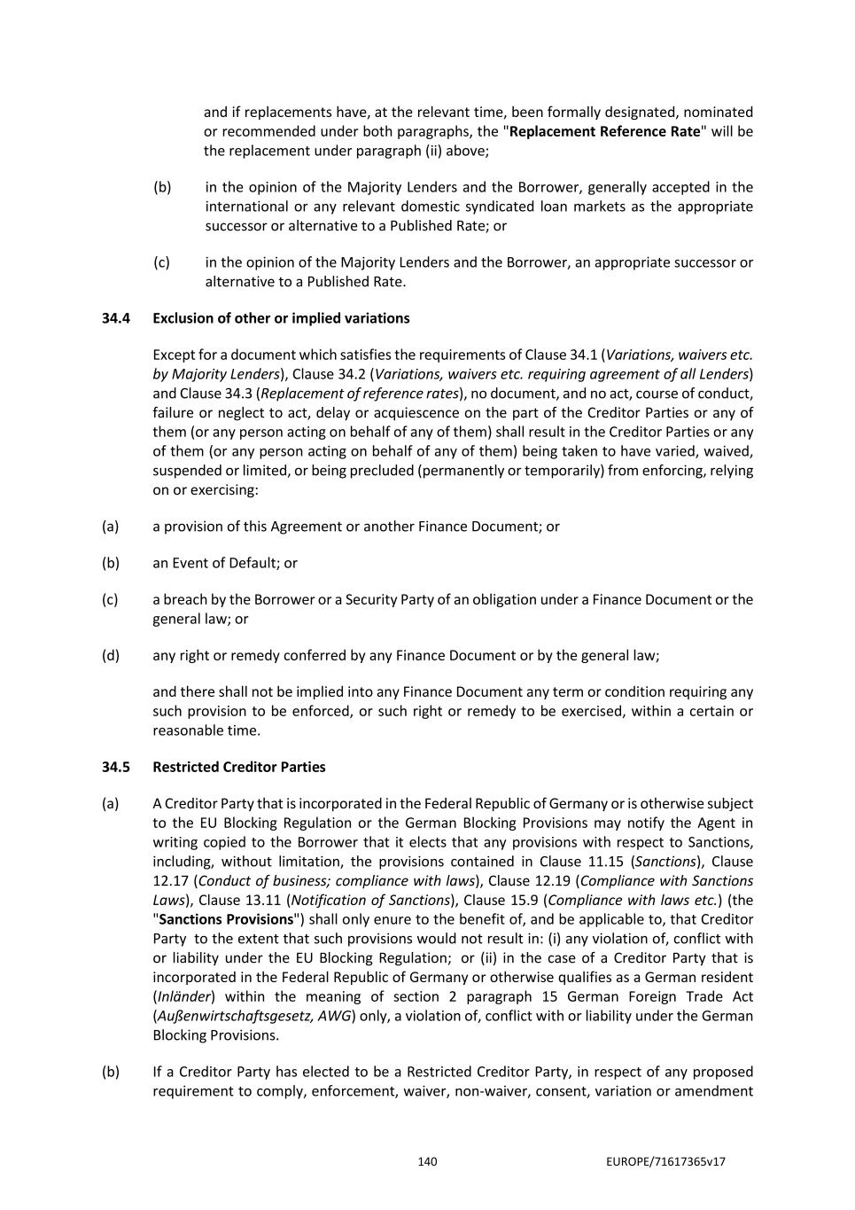 140 EUROPE/71617365v17 and if replacements have, at the relevant time, been formally designated, nominated or recommended under both paragraphs, the "Replacement Reference Rate" will be the replacement under paragraph (ii) above; (b) in the opinion of the Majority Lenders and the Borrower, generally accepted in the international or any relevant domestic syndicated loan markets as the appropriate successor or alternative to a Published Rate; or (c) in the opinion of the Majority Lenders and the Borrower, an appropriate successor or alternative to a Published Rate. 34.4 Exclusion of other or implied variations Except for a document which satisfies the requirements of Clause 34.1 (Variations, waivers etc. by Majority Lenders), Clause 34.2 (Variations, waivers etc. requiring agreement of all Lenders) and Clause 34.3 (Replacement of reference rates), no document, and no act, course of conduct, failure or neglect to act, delay or acquiescence on the part of the Creditor Parties or any of them (or any person acting on behalf of any of them) shall result in the Creditor Parties or any of them (or any person acting on behalf of any of them) being taken to have varied, waived, suspended or limited, or being precluded (permanently or temporarily) from enforcing, relying on or exercising: (a) a provision of this Agreement or another Finance Document; or (b) an Event of Default; or (c) a breach by the Borrower or a Security Party of an obligation under a Finance Document or the general law; or (d) any right or remedy conferred by any Finance Document or by the general law; and there shall not be implied into any Finance Document any term or condition requiring any such provision to be enforced, or such right or remedy to be exercised, within a certain or reasonable time. 34.5 Restricted Creditor Parties (a) A Creditor Party that is incorporated in the Federal Republic of Germany or is otherwise subject to the EU Blocking Regulation or the German Blocking Provisions may notify the Agent in writing copied to the Borrower that it elects that any provisions with respect to Sanctions, including, without limitation, the provisions contained in Clause 11.15 (Sanctions), Clause 12.17 (Conduct of business; compliance with laws), Clause 12.19 (Compliance with Sanctions Laws), Clause 13.11 (Notification of Sanctions), Clause 15.9 (Compliance with laws etc.) (the "Sanctions Provisions") shall only enure to the benefit of, and be applicable to, that Creditor Party to the extent that such provisions would not result in: (i) any violation of, conflict with or liability under the EU Blocking Regulation; or (ii) in the case of a Creditor Party that is incorporated in the Federal Republic of Germany or otherwise qualifies as a German resident (Inländer) within the meaning of section 2 paragraph 15 German Foreign Trade Act (Außenwirtschaftsgesetz, AWG) only, a violation of, conflict with or liability under the German Blocking Provisions. (b) If a Creditor Party has elected to be a Restricted Creditor Party, in respect of any proposed requirement to comply, enforcement, waiver, non-waiver, consent, variation or amendment