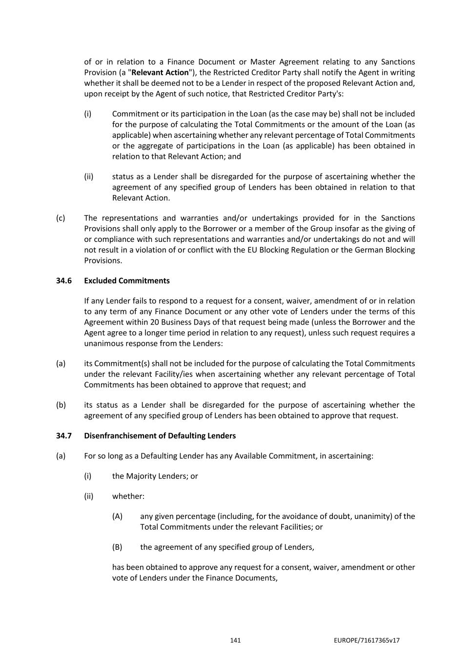 141 EUROPE/71617365v17 of or in relation to a Finance Document or Master Agreement relating to any Sanctions Provision (a "Relevant Action"), the Restricted Creditor Party shall notify the Agent in writing whether it shall be deemed not to be a Lender in respect of the proposed Relevant Action and, upon receipt by the Agent of such notice, that Restricted Creditor Party's: (i) Commitment or its participation in the Loan (as the case may be) shall not be included for the purpose of calculating the Total Commitments or the amount of the Loan (as applicable) when ascertaining whether any relevant percentage of Total Commitments or the aggregate of participations in the Loan (as applicable) has been obtained in relation to that Relevant Action; and (ii) status as a Lender shall be disregarded for the purpose of ascertaining whether the agreement of any specified group of Lenders has been obtained in relation to that Relevant Action. (c) The representations and warranties and/or undertakings provided for in the Sanctions Provisions shall only apply to the Borrower or a member of the Group insofar as the giving of or compliance with such representations and warranties and/or undertakings do not and will not result in a violation of or conflict with the EU Blocking Regulation or the German Blocking Provisions. 34.6 Excluded Commitments If any Lender fails to respond to a request for a consent, waiver, amendment of or in relation to any term of any Finance Document or any other vote of Lenders under the terms of this Agreement within 20 Business Days of that request being made (unless the Borrower and the Agent agree to a longer time period in relation to any request), unless such request requires a unanimous response from the Lenders: (a) its Commitment(s) shall not be included for the purpose of calculating the Total Commitments under the relevant Facility/ies when ascertaining whether any relevant percentage of Total Commitments has been obtained to approve that request; and (b) its status as a Lender shall be disregarded for the purpose of ascertaining whether the agreement of any specified group of Lenders has been obtained to approve that request. 34.7 Disenfranchisement of Defaulting Lenders (a) For so long as a Defaulting Lender has any Available Commitment, in ascertaining: (i) the Majority Lenders; or (ii) whether: (A) any given percentage (including, for the avoidance of doubt, unanimity) of the Total Commitments under the relevant Facilities; or (B) the agreement of any specified group of Lenders, has been obtained to approve any request for a consent, waiver, amendment or other vote of Lenders under the Finance Documents,