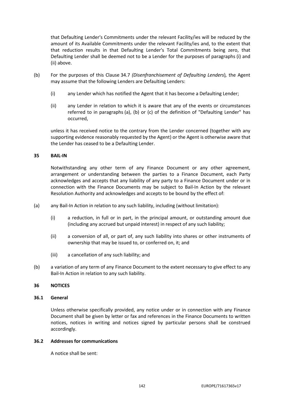 142 EUROPE/71617365v17 that Defaulting Lender's Commitments under the relevant Facility/ies will be reduced by the amount of its Available Commitments under the relevant Facility/ies and, to the extent that that reduction results in that Defaulting Lender's Total Commitments being zero, that Defaulting Lender shall be deemed not to be a Lender for the purposes of paragraphs (i) and (ii) above. (b) For the purposes of this Clause 34.7 (Disenfranchisement of Defaulting Lenders), the Agent may assume that the following Lenders are Defaulting Lenders: (i) any Lender which has notified the Agent that it has become a Defaulting Lender; (ii) any Lender in relation to which it is aware that any of the events or circumstances referred to in paragraphs (a), (b) or (c) of the definition of "Defaulting Lender" has occurred, unless it has received notice to the contrary from the Lender concerned (together with any supporting evidence reasonably requested by the Agent) or the Agent is otherwise aware that the Lender has ceased to be a Defaulting Lender. 35 BAIL-IN Notwithstanding any other term of any Finance Document or any other agreement, arrangement or understanding between the parties to a Finance Document, each Party acknowledges and accepts that any liability of any party to a Finance Document under or in connection with the Finance Documents may be subject to Bail-In Action by the relevant Resolution Authority and acknowledges and accepts to be bound by the effect of: (a) any Bail-In Action in relation to any such liability, including (without limitation): (i) a reduction, in full or in part, in the principal amount, or outstanding amount due (including any accrued but unpaid interest) in respect of any such liability; (ii) a conversion of all, or part of, any such liability into shares or other instruments of ownership that may be issued to, or conferred on, it; and (iii) a cancellation of any such liability; and (b) a variation of any term of any Finance Document to the extent necessary to give effect to any Bail-In Action in relation to any such liability. 36 NOTICES 36.1 General Unless otherwise specifically provided, any notice under or in connection with any Finance Document shall be given by letter or fax and references in the Finance Documents to written notices, notices in writing and notices signed by particular persons shall be construed accordingly. 36.2 Addresses for communications A notice shall be sent: