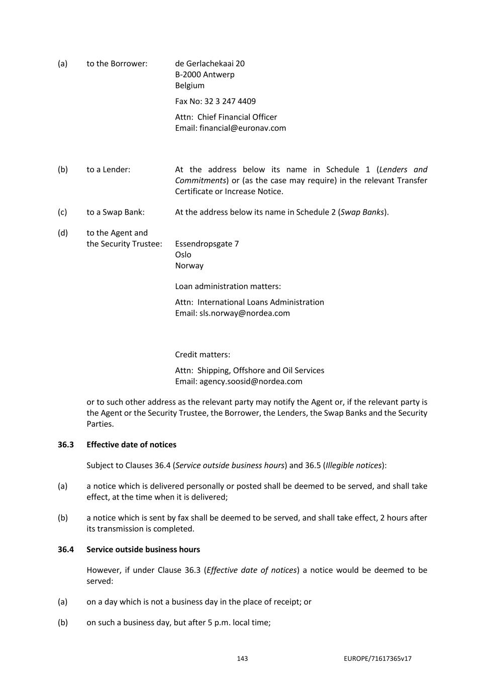 143 EUROPE/71617365v17 (a) to the Borrower: de Gerlachekaai 20 B-2000 Antwerp Belgium Fax No: 32 3 247 4409 Attn: Chief Financial Officer Email: financial@euronav.com (b) to a Lender: At the address below its name in Schedule 1 (Lenders and Commitments) or (as the case may require) in the relevant Transfer Certificate or Increase Notice. (c) to a Swap Bank: At the address below its name in Schedule 2 (Swap Banks). (d) to the Agent and the Security Trustee: Essendropsgate 7 Oslo Norway Loan administration matters: Attn: International Loans Administration Email: sls.norway@nordea.com Credit matters: Attn: Shipping, Offshore and Oil Services Email: agency.soosid@nordea.com or to such other address as the relevant party may notify the Agent or, if the relevant party is the Agent or the Security Trustee, the Borrower, the Lenders, the Swap Banks and the Security Parties. 36.3 Effective date of notices Subject to Clauses 36.4 (Service outside business hours) and 36.5 (Illegible notices): (a) a notice which is delivered personally or posted shall be deemed to be served, and shall take effect, at the time when it is delivered; (b) a notice which is sent by fax shall be deemed to be served, and shall take effect, 2 hours after its transmission is completed. 36.4 Service outside business hours However, if under Clause 36.3 (Effective date of notices) a notice would be deemed to be served: (a) on a day which is not a business day in the place of receipt; or (b) on such a business day, but after 5 p.m. local time;