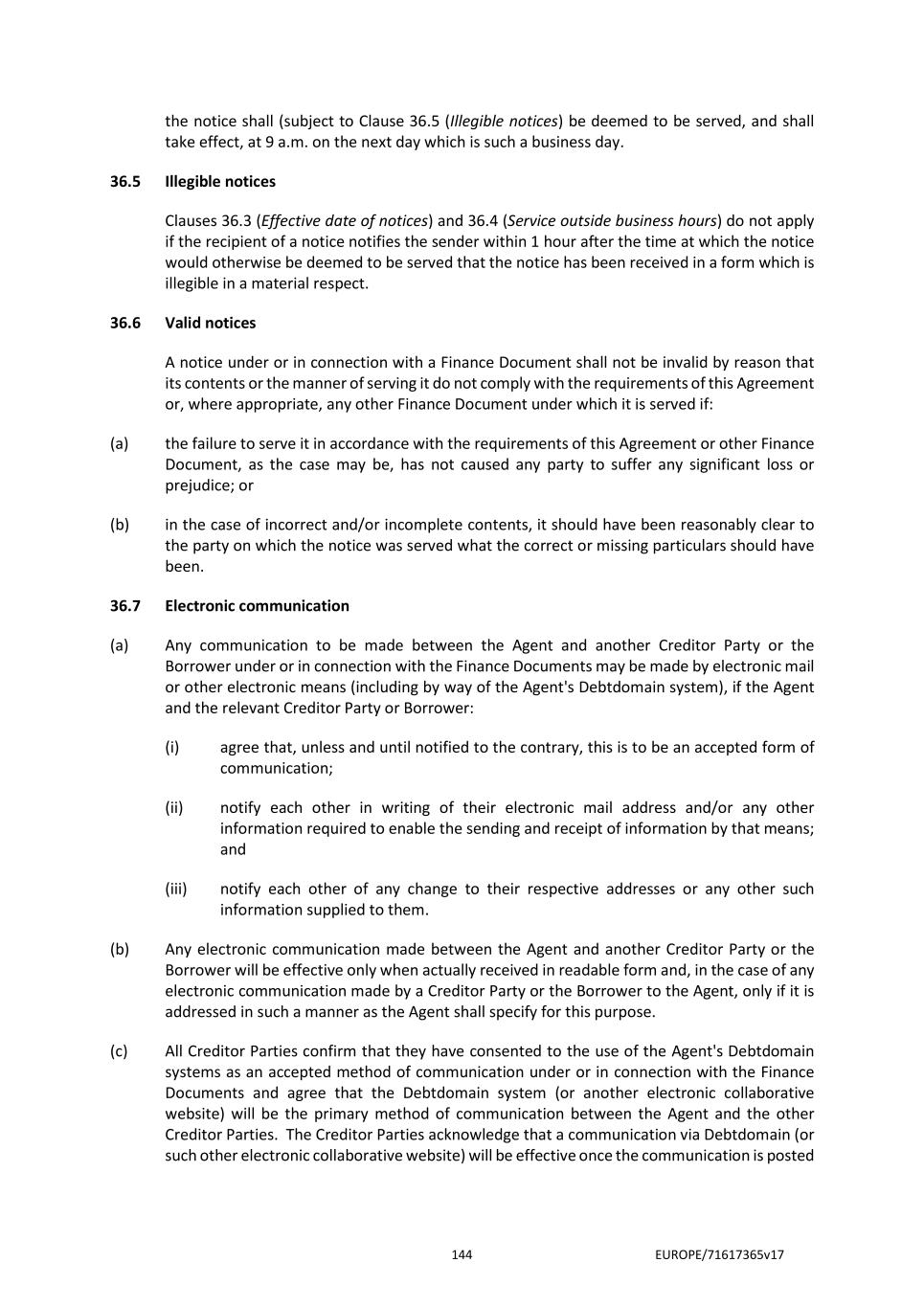 144 EUROPE/71617365v17 the notice shall (subject to Clause 36.5 (Illegible notices) be deemed to be served, and shall take effect, at 9 a.m. on the next day which is such a business day. 36.5 Illegible notices Clauses 36.3 (Effective date of notices) and 36.4 (Service outside business hours) do not apply if the recipient of a notice notifies the sender within 1 hour after the time at which the notice would otherwise be deemed to be served that the notice has been received in a form which is illegible in a material respect. 36.6 Valid notices A notice under or in connection with a Finance Document shall not be invalid by reason that its contents or the manner of serving it do not comply with the requirements of this Agreement or, where appropriate, any other Finance Document under which it is served if: (a) the failure to serve it in accordance with the requirements of this Agreement or other Finance Document, as the case may be, has not caused any party to suffer any significant loss or prejudice; or (b) in the case of incorrect and/or incomplete contents, it should have been reasonably clear to the party on which the notice was served what the correct or missing particulars should have been. 36.7 Electronic communication (a) Any communication to be made between the Agent and another Creditor Party or the Borrower under or in connection with the Finance Documents may be made by electronic mail or other electronic means (including by way of the Agent's Debtdomain system), if the Agent and the relevant Creditor Party or Borrower: (i) agree that, unless and until notified to the contrary, this is to be an accepted form of communication; (ii) notify each other in writing of their electronic mail address and/or any other information required to enable the sending and receipt of information by that means; and (iii) notify each other of any change to their respective addresses or any other such information supplied to them. (b) Any electronic communication made between the Agent and another Creditor Party or the Borrower will be effective only when actually received in readable form and, in the case of any electronic communication made by a Creditor Party or the Borrower to the Agent, only if it is addressed in such a manner as the Agent shall specify for this purpose. (c) All Creditor Parties confirm that they have consented to the use of the Agent's Debtdomain systems as an accepted method of communication under or in connection with the Finance Documents and agree that the Debtdomain system (or another electronic collaborative website) will be the primary method of communication between the Agent and the other Creditor Parties. The Creditor Parties acknowledge that a communication via Debtdomain (or such other electronic collaborative website) will be effective once the communication is posted