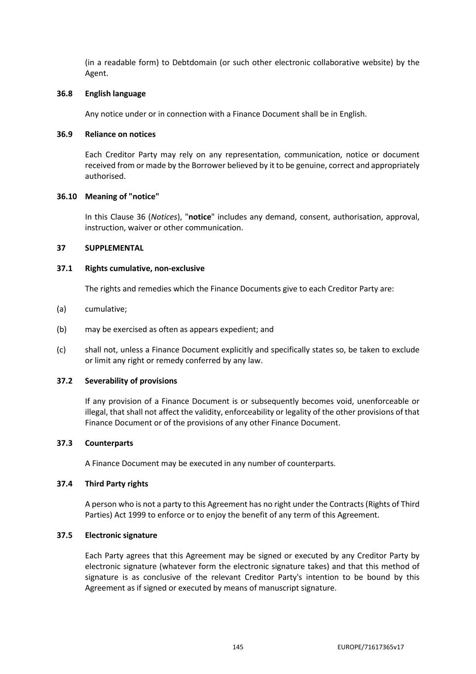 145 EUROPE/71617365v17 (in a readable form) to Debtdomain (or such other electronic collaborative website) by the Agent. 36.8 English language Any notice under or in connection with a Finance Document shall be in English. 36.9 Reliance on notices Each Creditor Party may rely on any representation, communication, notice or document received from or made by the Borrower believed by it to be genuine, correct and appropriately authorised. 36.10 Meaning of "notice" In this Clause 36 (Notices), "notice" includes any demand, consent, authorisation, approval, instruction, waiver or other communication. 37 SUPPLEMENTAL 37.1 Rights cumulative, non-exclusive The rights and remedies which the Finance Documents give to each Creditor Party are: (a) cumulative; (b) may be exercised as often as appears expedient; and (c) shall not, unless a Finance Document explicitly and specifically states so, be taken to exclude or limit any right or remedy conferred by any law. 37.2 Severability of provisions If any provision of a Finance Document is or subsequently becomes void, unenforceable or illegal, that shall not affect the validity, enforceability or legality of the other provisions of that Finance Document or of the provisions of any other Finance Document. 37.3 Counterparts A Finance Document may be executed in any number of counterparts. 37.4 Third Party rights A person who is not a party to this Agreement has no right under the Contracts (Rights of Third Parties) Act 1999 to enforce or to enjoy the benefit of any term of this Agreement. 37.5 Electronic signature Each Party agrees that this Agreement may be signed or executed by any Creditor Party by electronic signature (whatever form the electronic signature takes) and that this method of signature is as conclusive of the relevant Creditor Party's intention to be bound by this Agreement as if signed or executed by means of manuscript signature.