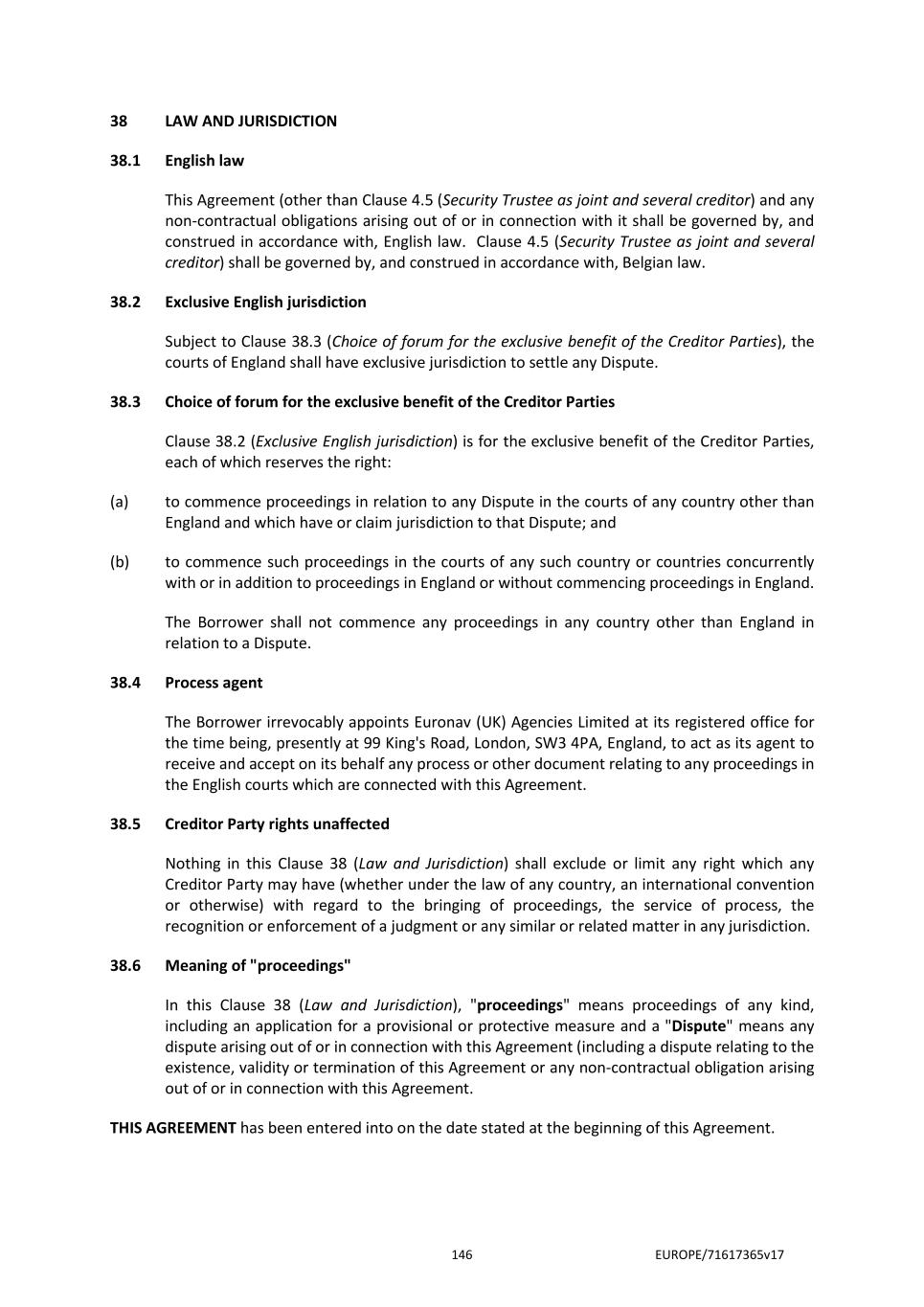 146 EUROPE/71617365v17 38 LAW AND JURISDICTION 38.1 English law This Agreement (other than Clause 4.5 (Security Trustee as joint and several creditor) and any non-contractual obligations arising out of or in connection with it shall be governed by, and construed in accordance with, English law. Clause 4.5 (Security Trustee as joint and several creditor) shall be governed by, and construed in accordance with, Belgian law. 38.2 Exclusive English jurisdiction Subject to Clause 38.3 (Choice of forum for the exclusive benefit of the Creditor Parties), the courts of England shall have exclusive jurisdiction to settle any Dispute. 38.3 Choice of forum for the exclusive benefit of the Creditor Parties Clause 38.2 (Exclusive English jurisdiction) is for the exclusive benefit of the Creditor Parties, each of which reserves the right: (a) to commence proceedings in relation to any Dispute in the courts of any country other than England and which have or claim jurisdiction to that Dispute; and (b) to commence such proceedings in the courts of any such country or countries concurrently with or in addition to proceedings in England or without commencing proceedings in England. The Borrower shall not commence any proceedings in any country other than England in relation to a Dispute. 38.4 Process agent The Borrower irrevocably appoints Euronav (UK) Agencies Limited at its registered office for the time being, presently at 99 King's Road, London, SW3 4PA, England, to act as its agent to receive and accept on its behalf any process or other document relating to any proceedings in the English courts which are connected with this Agreement. 38.5 Creditor Party rights unaffected Nothing in this Clause 38 (Law and Jurisdiction) shall exclude or limit any right which any Creditor Party may have (whether under the law of any country, an international convention or otherwise) with regard to the bringing of proceedings, the service of process, the recognition or enforcement of a judgment or any similar or related matter in any jurisdiction. 38.6 Meaning of "proceedings" In this Clause 38 (Law and Jurisdiction), "proceedings" means proceedings of any kind, including an application for a provisional or protective measure and a "Dispute" means any dispute arising out of or in connection with this Agreement (including a dispute relating to the existence, validity or termination of this Agreement or any non-contractual obligation arising out of or in connection with this Agreement. THIS AGREEMENT has been entered into on the date stated at the beginning of this Agreement.