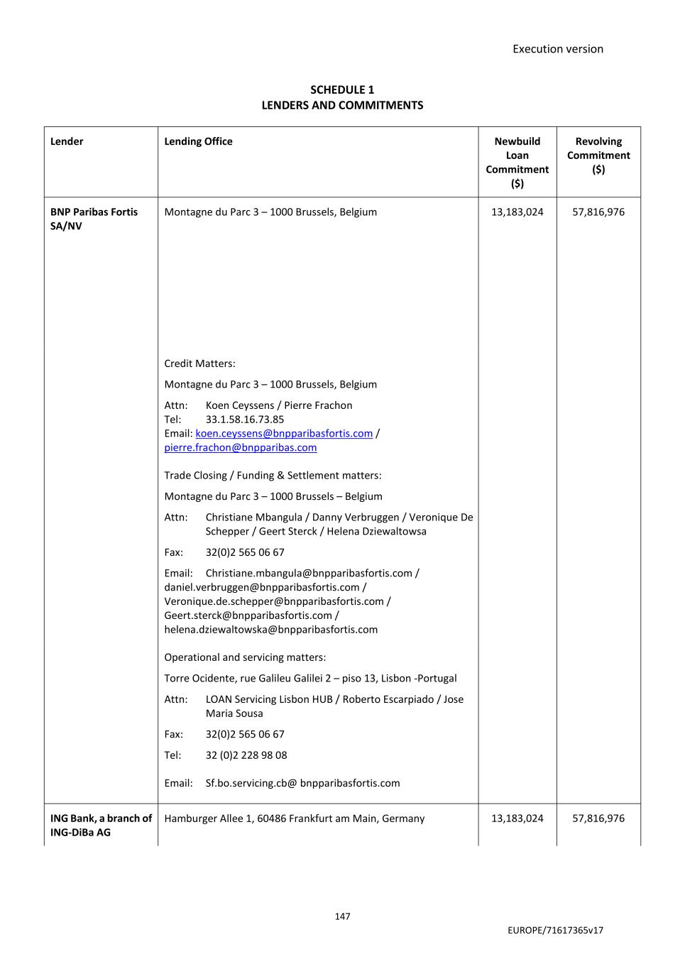 Execution version 147 EUROPE/71617365v17 SCHEDULE 1 LENDERS AND COMMITMENTS Lender Lending Office Newbuild Loan Commitment ($) Revolving Commitment ($) BNP Paribas Fortis SA/NV Montagne du Parc 3 – 1000 Brussels, Belgium 13,183,024 57,816,976 Credit Matters: Montagne du Parc 3 – 1000 Brussels, Belgium Attn: Koen Ceyssens / Pierre Frachon Tel: 33.1.58.16.73.85 Email: koen.ceyssens@bnpparibasfortis.com / pierre.frachon@bnpparibas.com Trade Closing / Funding & Settlement matters: Montagne du Parc 3 – 1000 Brussels – Belgium Attn: Christiane Mbangula / Danny Verbruggen / Veronique De Schepper / Geert Sterck / Helena Dziewaltowsa Fax: 32(0)2 565 06 67 Email: Christiane.mbangula@bnpparibasfortis.com / daniel.verbruggen@bnpparibasfortis.com / Veronique.de.schepper@bnpparibasfortis.com / Geert.sterck@bnpparibasfortis.com / helena.dziewaltowska@bnpparibasfortis.com Operational and servicing matters: Torre Ocidente, rue Galileu Galilei 2 – piso 13, Lisbon -Portugal Attn: LOAN Servicing Lisbon HUB / Roberto Escarpiado / Jose Maria Sousa Fax: 32(0)2 565 06 67 Tel: 32 (0)2 228 98 08 Email: Sf.bo.servicing.cb@ bnpparibasfortis.com ING Bank, a branch of ING-DiBa AG Hamburger Allee 1, 60486 Frankfurt am Main, Germany 13,183,024 57,816,976