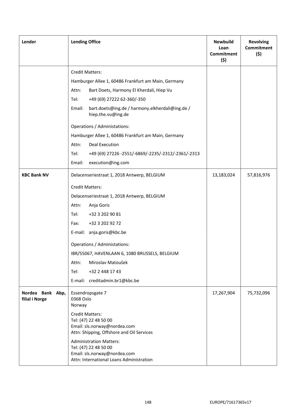 148 EUROPE/71617365v17 Lender Lending Office Newbuild Loan Commitment ($) Revolving Commitment ($) Credit Matters: Hamburger Allee 1, 60486 Frankfurt am Main, Germany Attn: Bart Doets, Harmony El Kherdali, Hiep Vu Tel: +49 (69) 27222 62-360/-350 Email: bart.doets@ing.de / harmony.elkherdali@ing.de / hiep.the.vu@ing.de Operations / Administations: Hamburger Allee 1, 60486 Frankfurt am Main, Germany Attn: Deal Execution Tel: +49 (69) 27226 -2551/-6869/-2235/-2312/-2361/-2313 Email: execution@ing.com KBC Bank NV Delacenseriestraat 1, 2018 Antwerp, BELGIUM 13,183,024 57,816,976 Credit Matters: Delacenseriestraat 1, 2018 Antwerp, BELGIUM Attn: Anja Goris Tel: +32 3 202 90 81 Fax: +32 3 202 92 72 E-mail: anja.goris@kbc.be Operations / Administations: IBR/55067, HAVENLAAN 6, 1080 BRUSSELS, BELGIUM Attn: Miroslav Matoušek Tel: +32 2 448 17 43 E-mail: creditadmin.br1@kbc.be Nordea Bank Abp, filial i Norge Essendropsgate 7 0368 Oslo Norway Credit Matters: Tel: (47) 22 48 50 00 Email: sls.norway@nordea.com Attn: Shipping, Offshore and Oil Services Administration Matters: Tel: (47) 22 48 50 00 Email: sls.norway@nordea.com Attn: International Loans Administration 17,267,904 75,732,096