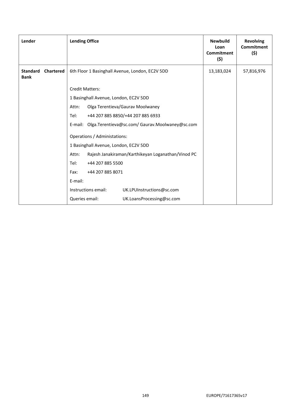 149 EUROPE/71617365v17 Lender Lending Office Newbuild Loan Commitment ($) Revolving Commitment ($) Standard Chartered Bank 6th Floor 1 Basinghall Avenue, London, EC2V 5DD 13,183,024 57,816,976 Credit Matters: 1 Basinghall Avenue, London, EC2V 5DD Attn: Olga Terentieva/Gaurav Moolwaney Tel: +44 207 885 8850/+44 207 885 6933 E-mail: Olga.Terentieva@sc.com/ Gaurav.Moolwaney@sc.com Operations / Administations: 1 Basinghall Avenue, London, EC2V 5DD Attn: Rajesh Janakiraman/Karthikeyan Loganathan/Vinod PC Tel: +44 207 885 5500 Fax: +44 207 885 8071 E-mail: Instructions email: UK.LPUInstructions@sc.com Queries email: UK.LoansProcessing@sc.com