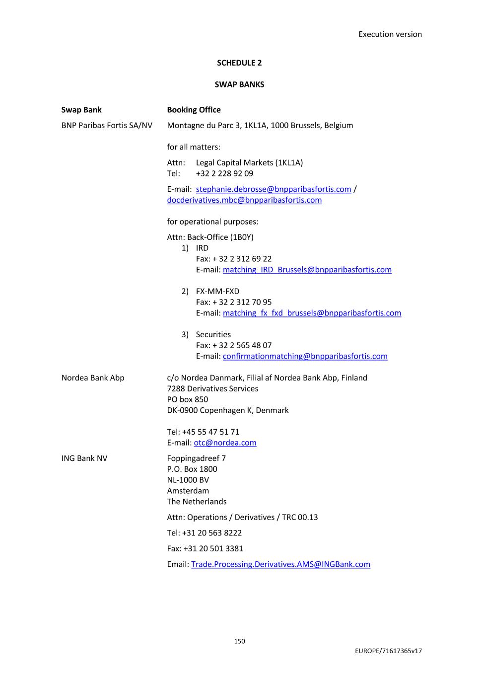Execution version 150 EUROPE/71617365v17 SCHEDULE 2 SWAP BANKS Swap Bank Booking Office BNP Paribas Fortis SA/NV Montagne du Parc 3, 1KL1A, 1000 Brussels, Belgium for all matters: Attn: Legal Capital Markets (1KL1A) Tel: +32 2 228 92 09 E-mail: stephanie.debrosse@bnpparibasfortis.com / docderivatives.mbc@bnpparibasfortis.com for operational purposes: Attn: Back-Office (1B0Y) 1) IRD Fax: + 32 2 312 69 22 E-mail: matching_IRD_Brussels@bnpparibasfortis.com 2) FX-MM-FXD Fax: + 32 2 312 70 95 E-mail: matching_fx_fxd_brussels@bnpparibasfortis.com 3) Securities Fax: + 32 2 565 48 07 E-mail: confirmationmatching@bnpparibasfortis.com Nordea Bank Abp c/o Nordea Danmark, Filial af Nordea Bank Abp, Finland 7288 Derivatives Services PO box 850 DK-0900 Copenhagen K, Denmark Tel: +45 55 47 51 71 E-mail: otc@nordea.com ING Bank NV Foppingadreef 7 P.O. Box 1800 NL-1000 BV Amsterdam The Netherlands Attn: Operations / Derivatives / TRC 00.13 Tel: +31 20 563 8222 Fax: +31 20 501 3381 Email: Trade.Processing.Derivatives.AMS@INGBank.com