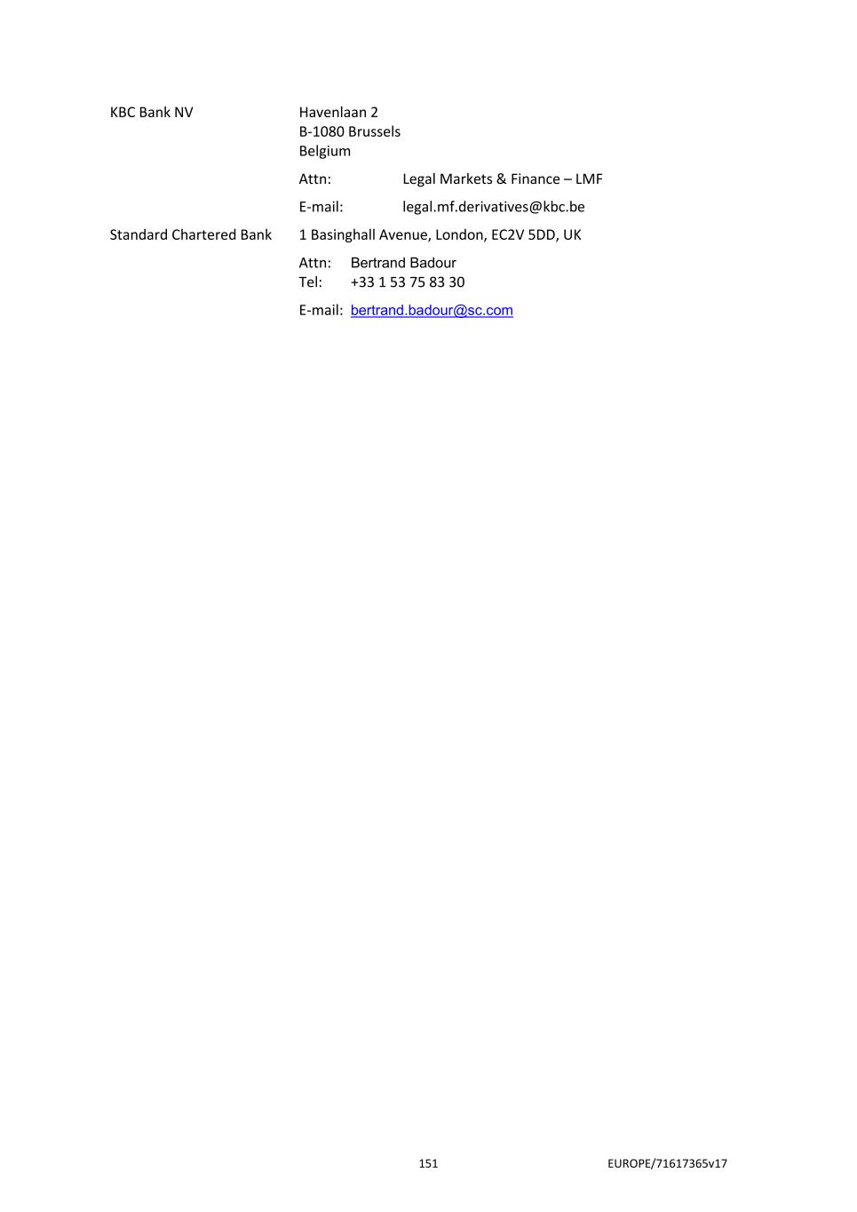 151 EUROPE/71617365v17 KBC Bank NV Havenlaan 2 B-1080 Brussels Belgium Attn: Legal Markets & Finance – LMF E-mail: legal.mf.derivatives@kbc.be Standard Chartered Bank 1 Basinghall Avenue, London, EC2V 5DD, UK Attn: Bertrand Badour Tel: +33 1 53 75 83 30 E-mail: bertrand.badour@sc.com