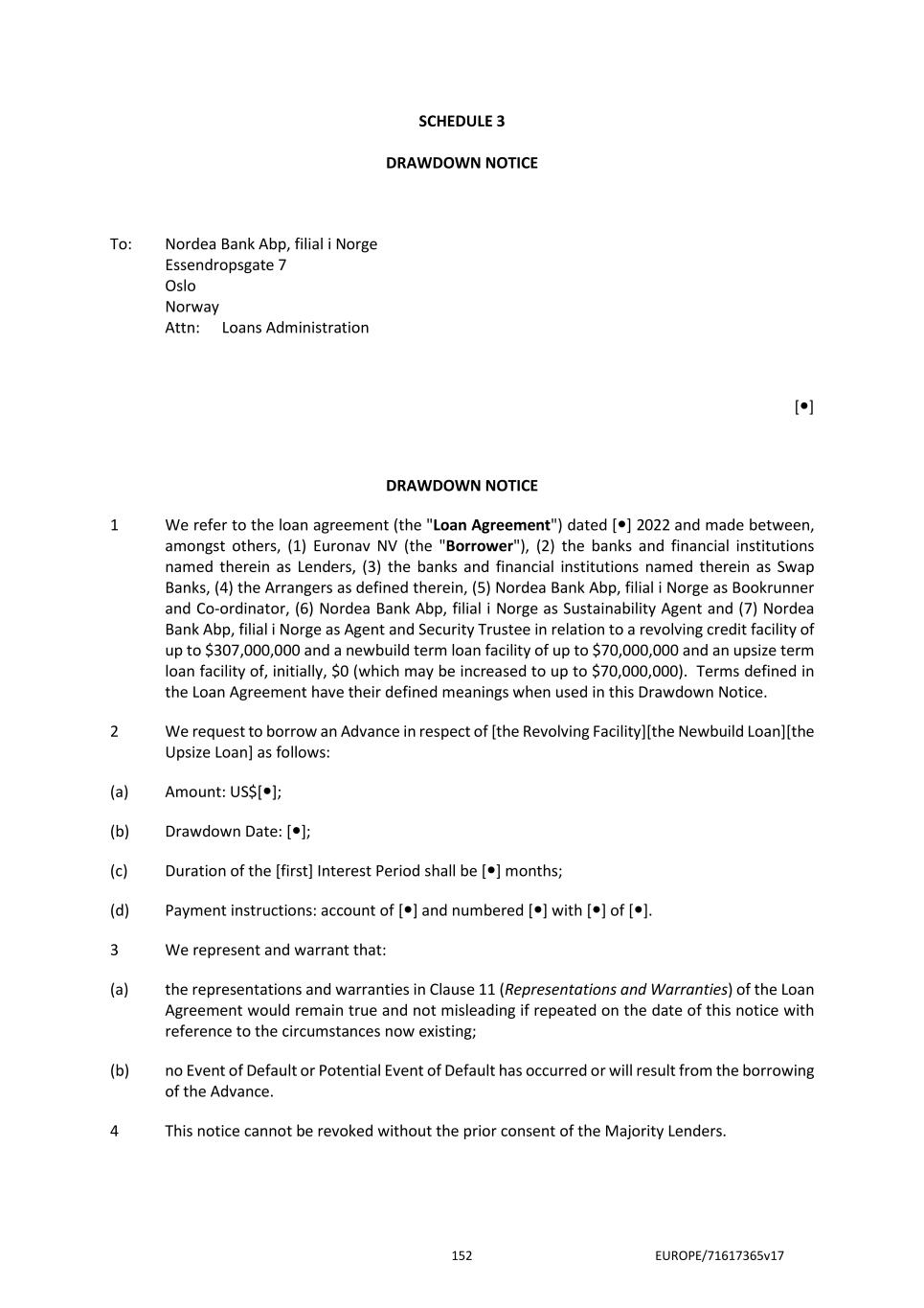 152 EUROPE/71617365v17 SCHEDULE 3 DRAWDOWN NOTICE To: Nordea Bank Abp, filial i Norge Essendropsgate 7 Oslo Norway Attn: Loans Administration [] DRAWDOWN NOTICE 1 We refer to the loan agreement (the "Loan Agreement") dated [] 2022 and made between, amongst others, (1) Euronav NV (the "Borrower"), (2) the banks and financial institutions named therein as Lenders, (3) the banks and financial institutions named therein as Swap Banks, (4) the Arrangers as defined therein, (5) Nordea Bank Abp, filial i Norge as Bookrunner and Co-ordinator, (6) Nordea Bank Abp, filial i Norge as Sustainability Agent and (7) Nordea Bank Abp, filial i Norge as Agent and Security Trustee in relation to a revolving credit facility of up to $307,000,000 and a newbuild term loan facility of up to $70,000,000 and an upsize term loan facility of, initially, $0 (which may be increased to up to $70,000,000). Terms defined in the Loan Agreement have their defined meanings when used in this Drawdown Notice. 2 We request to borrow an Advance in respect of [the Revolving Facility][the Newbuild Loan][the Upsize Loan] as follows: (a) Amount: US$[]; (b) Drawdown Date: []; (c) Duration of the [first] Interest Period shall be [] months; (d) Payment instructions: account of [] and numbered [] with [] of []. 3 We represent and warrant that: (a) the representations and warranties in Clause 11 (Representations and Warranties) of the Loan Agreement would remain true and not misleading if repeated on the date of this notice with reference to the circumstances now existing; (b) no Event of Default or Potential Event of Default has occurred or will result from the borrowing of the Advance. 4 This notice cannot be revoked without the prior consent of the Majority Lenders.