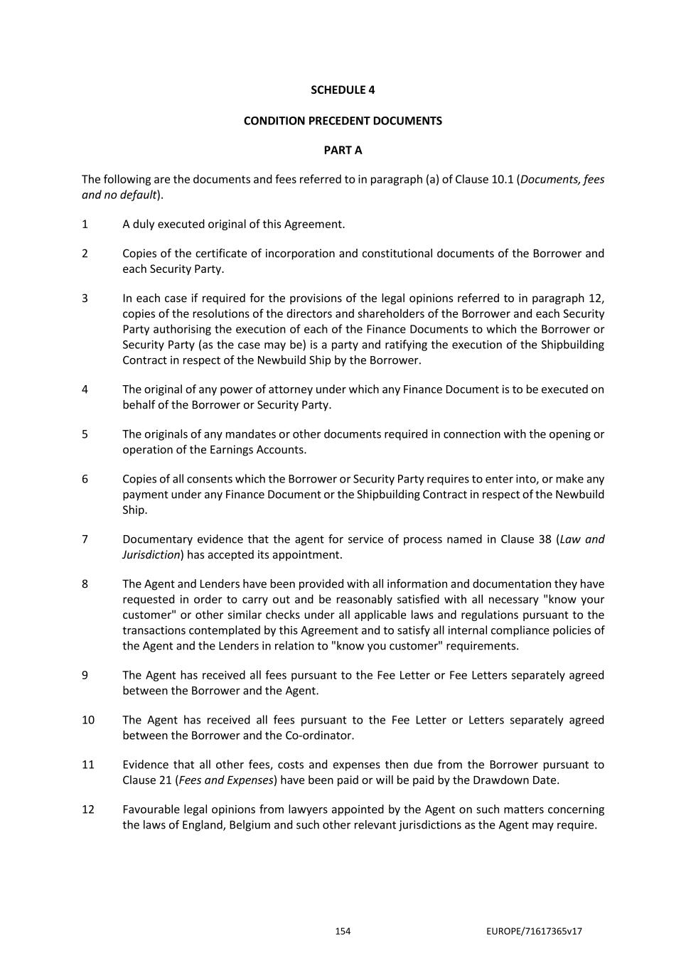 154 EUROPE/71617365v17 SCHEDULE 4 CONDITION PRECEDENT DOCUMENTS PART A The following are the documents and fees referred to in paragraph (a) of Clause 10.1 (Documents, fees and no default). 1 A duly executed original of this Agreement. 2 Copies of the certificate of incorporation and constitutional documents of the Borrower and each Security Party. 3 In each case if required for the provisions of the legal opinions referred to in paragraph 12, copies of the resolutions of the directors and shareholders of the Borrower and each Security Party authorising the execution of each of the Finance Documents to which the Borrower or Security Party (as the case may be) is a party and ratifying the execution of the Shipbuilding Contract in respect of the Newbuild Ship by the Borrower. 4 The original of any power of attorney under which any Finance Document is to be executed on behalf of the Borrower or Security Party. 5 The originals of any mandates or other documents required in connection with the opening or operation of the Earnings Accounts. 6 Copies of all consents which the Borrower or Security Party requires to enter into, or make any payment under any Finance Document or the Shipbuilding Contract in respect of the Newbuild Ship. 7 Documentary evidence that the agent for service of process named in Clause 38 (Law and Jurisdiction) has accepted its appointment. 8 The Agent and Lenders have been provided with all information and documentation they have requested in order to carry out and be reasonably satisfied with all necessary "know your customer" or other similar checks under all applicable laws and regulations pursuant to the transactions contemplated by this Agreement and to satisfy all internal compliance policies of the Agent and the Lenders in relation to "know you customer" requirements. 9 The Agent has received all fees pursuant to the Fee Letter or Fee Letters separately agreed between the Borrower and the Agent. 10 The Agent has received all fees pursuant to the Fee Letter or Letters separately agreed between the Borrower and the Co-ordinator. 11 Evidence that all other fees, costs and expenses then due from the Borrower pursuant to Clause 21 (Fees and Expenses) have been paid or will be paid by the Drawdown Date. 12 Favourable legal opinions from lawyers appointed by the Agent on such matters concerning the laws of England, Belgium and such other relevant jurisdictions as the Agent may require.