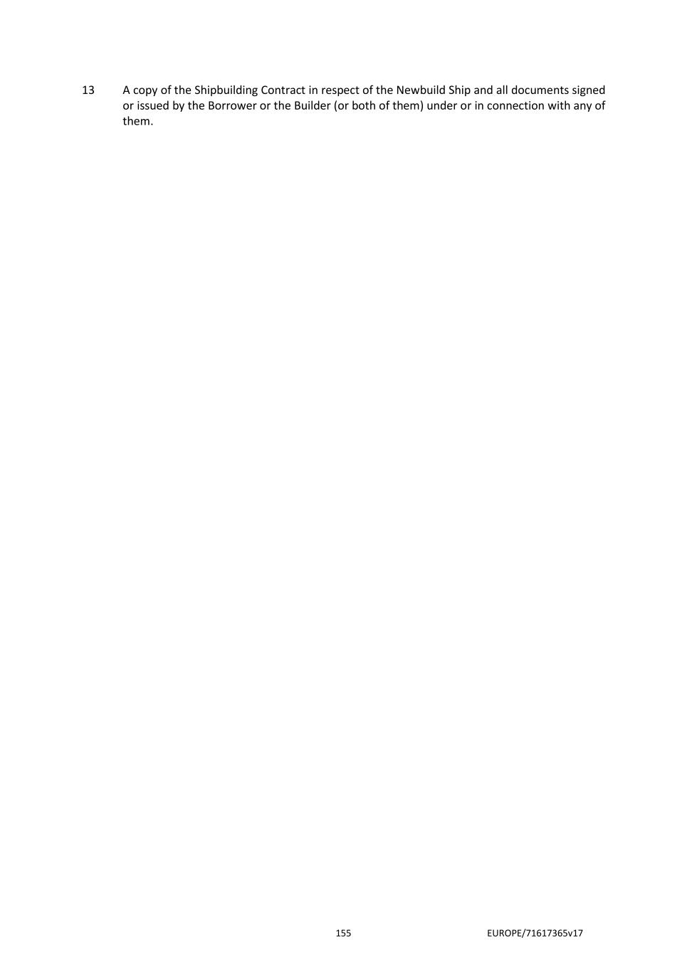 155 EUROPE/71617365v17 13 A copy of the Shipbuilding Contract in respect of the Newbuild Ship and all documents signed or issued by the Borrower or the Builder (or both of them) under or in connection with any of them.