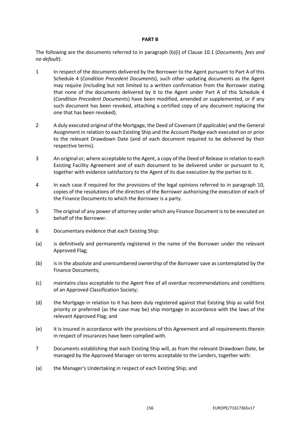 156 EUROPE/71617365v17 PART B The following are the documents referred to in paragraph (b)(i) of Clause 10.1 (Documents, fees and no default). 1 In respect of the documents delivered by the Borrower to the Agent pursuant to Part A of this Schedule 4 (Condition Precedent Documents), such other updating documents as the Agent may require (including but not limited to a written confirmation from the Borrower stating that none of the documents delivered by it to the Agent under Part A of this Schedule 4 (Condition Precedent Documents) have been modified, amended or supplemented, or if any such document has been revoked, attaching a certified copy of any document replacing the one that has been revoked). 2 A duly executed original of the Mortgage, the Deed of Covenant (if applicable) and the General Assignment in relation to each Existing Ship and the Account Pledge each executed on or prior to the relevant Drawdown Date (and of each document required to be delivered by their respective terms). 3 An original or, where acceptable to the Agent, a copy of the Deed of Release in relation to each Existing Facility Agreement and of each document to be delivered under or pursuant to it, together with evidence satisfactory to the Agent of its due execution by the parties to it. 4 In each case if required for the provisions of the legal opinions referred to in paragraph 10, copies of the resolutions of the directors of the Borrower authorising the execution of each of the Finance Documents to which the Borrower is a party. 5 The original of any power of attorney under which any Finance Document is to be executed on behalf of the Borrower. 6 Documentary evidence that each Existing Ship: (a) is definitively and permanently registered in the name of the Borrower under the relevant Approved Flag; (b) is in the absolute and unencumbered ownership of the Borrower save as contemplated by the Finance Documents; (c) maintains class acceptable to the Agent free of all overdue recommendations and conditions of an Approved Classification Society; (d) the Mortgage in relation to it has been duly registered against that Existing Ship as valid first priority or preferred (as the case may be) ship mortgage in accordance with the laws of the relevant Approved Flag; and (e) it is insured in accordance with the provisions of this Agreement and all requirements therein in respect of insurances have been complied with. 7 Documents establishing that each Existing Ship will, as from the relevant Drawdown Date, be managed by the Approved Manager on terms acceptable to the Lenders, together with: (a) the Manager's Undertaking in respect of each Existing Ship; and