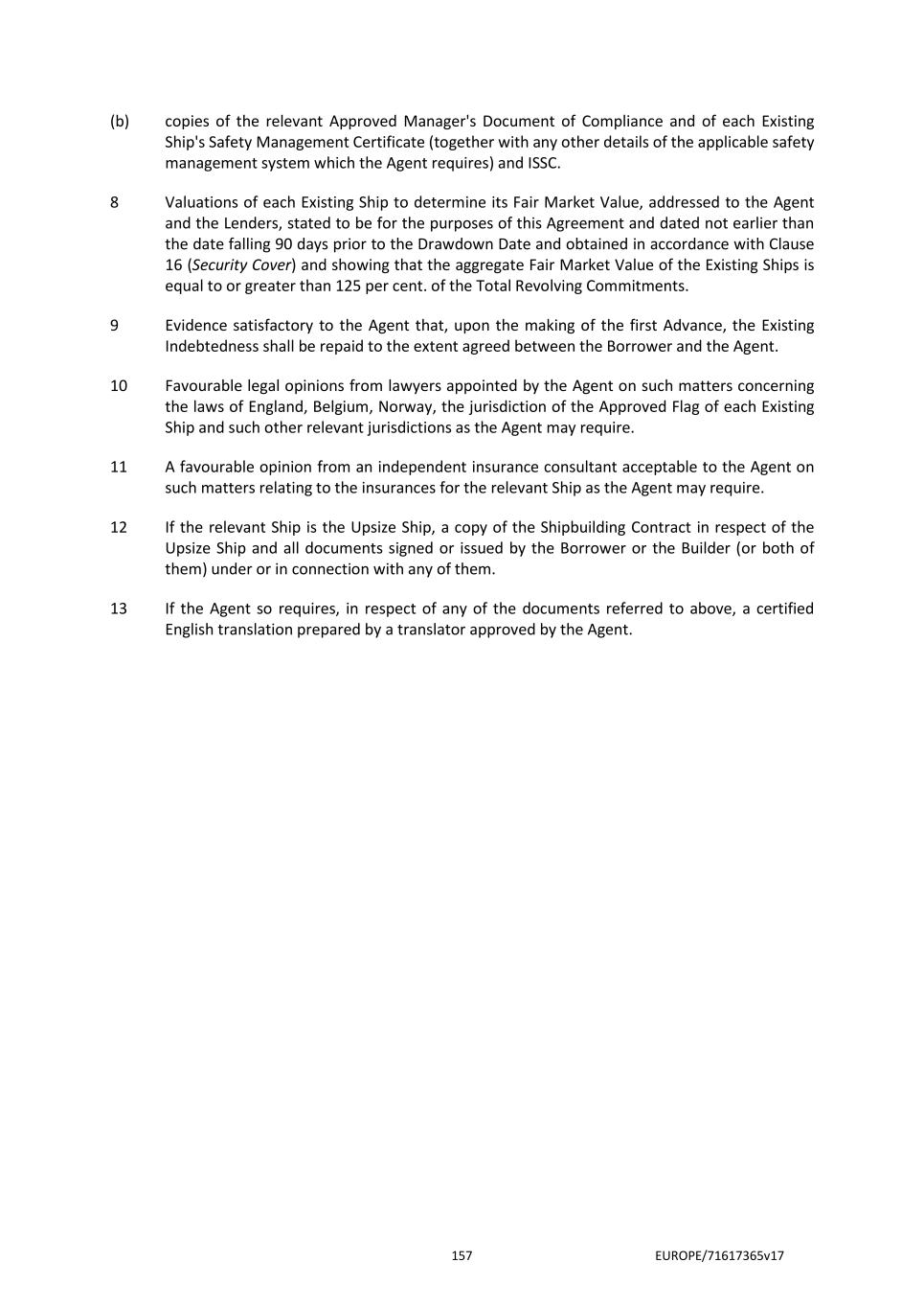 157 EUROPE/71617365v17 (b) copies of the relevant Approved Manager's Document of Compliance and of each Existing Ship's Safety Management Certificate (together with any other details of the applicable safety management system which the Agent requires) and ISSC. 8 Valuations of each Existing Ship to determine its Fair Market Value, addressed to the Agent and the Lenders, stated to be for the purposes of this Agreement and dated not earlier than the date falling 90 days prior to the Drawdown Date and obtained in accordance with Clause 16 (Security Cover) and showing that the aggregate Fair Market Value of the Existing Ships is equal to or greater than 125 per cent. of the Total Revolving Commitments. 9 Evidence satisfactory to the Agent that, upon the making of the first Advance, the Existing Indebtedness shall be repaid to the extent agreed between the Borrower and the Agent. 10 Favourable legal opinions from lawyers appointed by the Agent on such matters concerning the laws of England, Belgium, Norway, the jurisdiction of the Approved Flag of each Existing Ship and such other relevant jurisdictions as the Agent may require. 11 A favourable opinion from an independent insurance consultant acceptable to the Agent on such matters relating to the insurances for the relevant Ship as the Agent may require. 12 If the relevant Ship is the Upsize Ship, a copy of the Shipbuilding Contract in respect of the Upsize Ship and all documents signed or issued by the Borrower or the Builder (or both of them) under or in connection with any of them. 13 If the Agent so requires, in respect of any of the documents referred to above, a certified English translation prepared by a translator approved by the Agent.