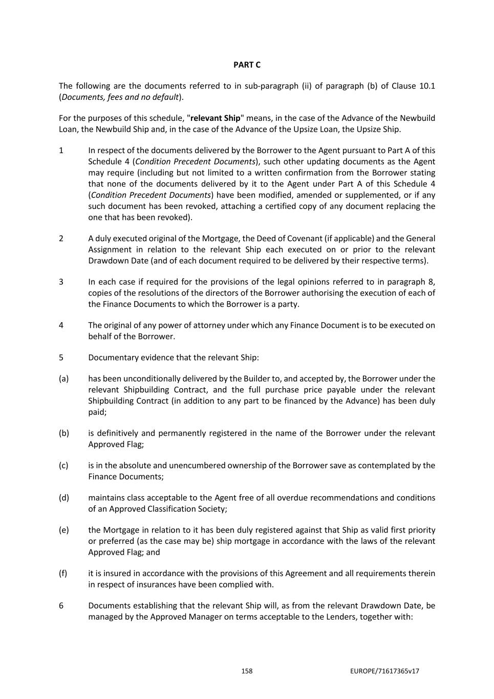 158 EUROPE/71617365v17 PART C The following are the documents referred to in sub-paragraph (ii) of paragraph (b) of Clause 10.1 (Documents, fees and no default). For the purposes of this schedule, "relevant Ship" means, in the case of the Advance of the Newbuild Loan, the Newbuild Ship and, in the case of the Advance of the Upsize Loan, the Upsize Ship. 1 In respect of the documents delivered by the Borrower to the Agent pursuant to Part A of this Schedule 4 (Condition Precedent Documents), such other updating documents as the Agent may require (including but not limited to a written confirmation from the Borrower stating that none of the documents delivered by it to the Agent under Part A of this Schedule 4 (Condition Precedent Documents) have been modified, amended or supplemented, or if any such document has been revoked, attaching a certified copy of any document replacing the one that has been revoked). 2 A duly executed original of the Mortgage, the Deed of Covenant (if applicable) and the General Assignment in relation to the relevant Ship each executed on or prior to the relevant Drawdown Date (and of each document required to be delivered by their respective terms). 3 In each case if required for the provisions of the legal opinions referred to in paragraph 8, copies of the resolutions of the directors of the Borrower authorising the execution of each of the Finance Documents to which the Borrower is a party. 4 The original of any power of attorney under which any Finance Document is to be executed on behalf of the Borrower. 5 Documentary evidence that the relevant Ship: (a) has been unconditionally delivered by the Builder to, and accepted by, the Borrower under the relevant Shipbuilding Contract, and the full purchase price payable under the relevant Shipbuilding Contract (in addition to any part to be financed by the Advance) has been duly paid; (b) is definitively and permanently registered in the name of the Borrower under the relevant Approved Flag; (c) is in the absolute and unencumbered ownership of the Borrower save as contemplated by the Finance Documents; (d) maintains class acceptable to the Agent free of all overdue recommendations and conditions of an Approved Classification Society; (e) the Mortgage in relation to it has been duly registered against that Ship as valid first priority or preferred (as the case may be) ship mortgage in accordance with the laws of the relevant Approved Flag; and (f) it is insured in accordance with the provisions of this Agreement and all requirements therein in respect of insurances have been complied with. 6 Documents establishing that the relevant Ship will, as from the relevant Drawdown Date, be managed by the Approved Manager on terms acceptable to the Lenders, together with: