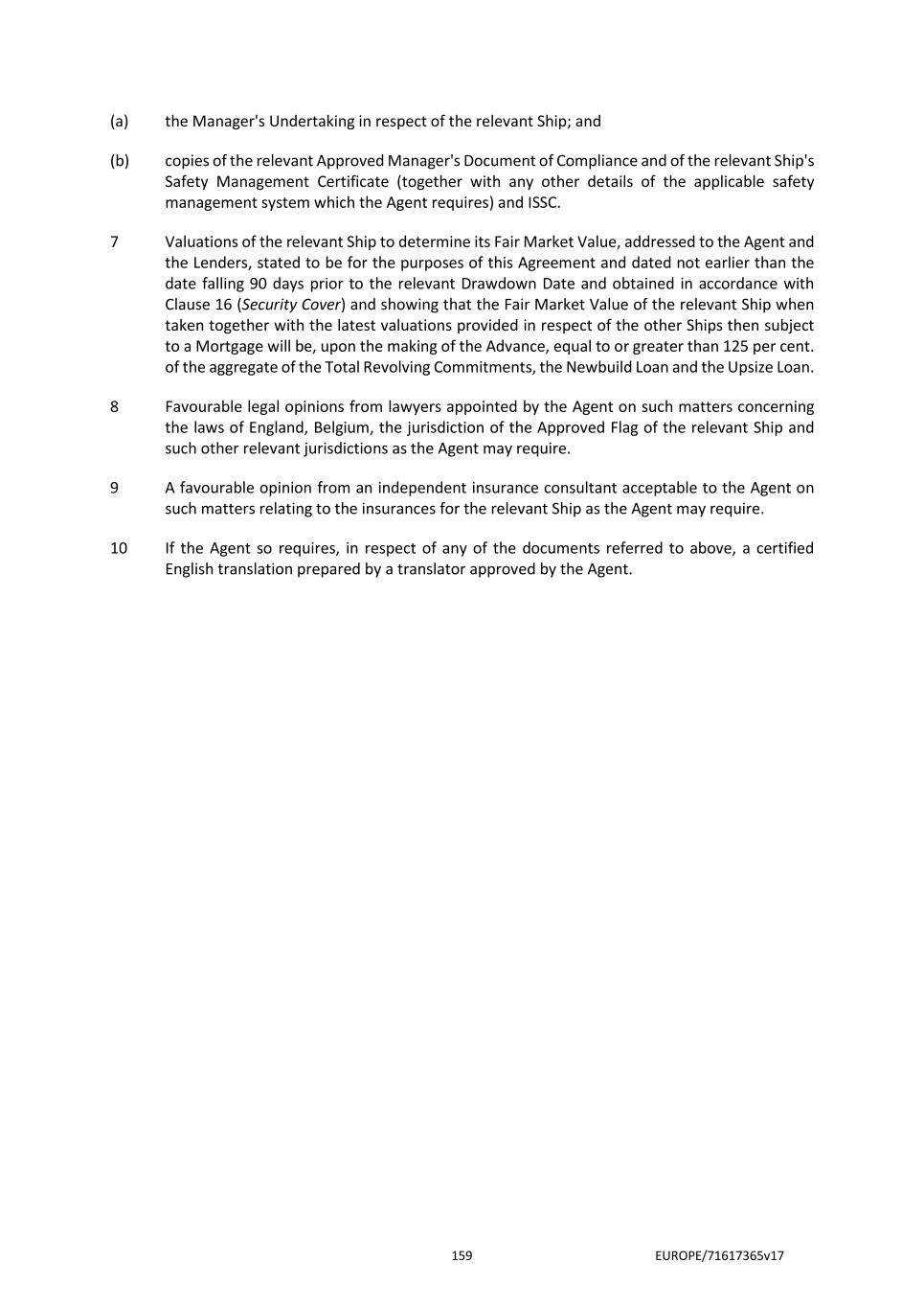 159 EUROPE/71617365v17 (a) the Manager's Undertaking in respect of the relevant Ship; and (b) copies of the relevant Approved Manager's Document of Compliance and of the relevant Ship's Safety Management Certificate (together with any other details of the applicable safety management system which the Agent requires) and ISSC. 7 Valuations of the relevant Ship to determine its Fair Market Value, addressed to the Agent and the Lenders, stated to be for the purposes of this Agreement and dated not earlier than the date falling 90 days prior to the relevant Drawdown Date and obtained in accordance with Clause 16 (Security Cover) and showing that the Fair Market Value of the relevant Ship when taken together with the latest valuations provided in respect of the other Ships then subject to a Mortgage will be, upon the making of the Advance, equal to or greater than 125 per cent. of the aggregate of the Total Revolving Commitments, the Newbuild Loan and the Upsize Loan. 8 Favourable legal opinions from lawyers appointed by the Agent on such matters concerning the laws of England, Belgium, the jurisdiction of the Approved Flag of the relevant Ship and such other relevant jurisdictions as the Agent may require. 9 A favourable opinion from an independent insurance consultant acceptable to the Agent on such matters relating to the insurances for the relevant Ship as the Agent may require. 10 If the Agent so requires, in respect of any of the documents referred to above, a certified English translation prepared by a translator approved by the Agent.