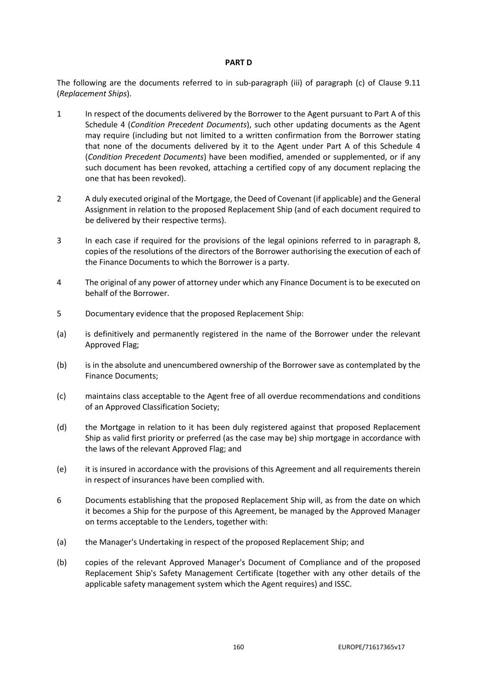 160 EUROPE/71617365v17 PART D The following are the documents referred to in sub-paragraph (iii) of paragraph (c) of Clause 9.11 (Replacement Ships). 1 In respect of the documents delivered by the Borrower to the Agent pursuant to Part A of this Schedule 4 (Condition Precedent Documents), such other updating documents as the Agent may require (including but not limited to a written confirmation from the Borrower stating that none of the documents delivered by it to the Agent under Part A of this Schedule 4 (Condition Precedent Documents) have been modified, amended or supplemented, or if any such document has been revoked, attaching a certified copy of any document replacing the one that has been revoked). 2 A duly executed original of the Mortgage, the Deed of Covenant (if applicable) and the General Assignment in relation to the proposed Replacement Ship (and of each document required to be delivered by their respective terms). 3 In each case if required for the provisions of the legal opinions referred to in paragraph 8, copies of the resolutions of the directors of the Borrower authorising the execution of each of the Finance Documents to which the Borrower is a party. 4 The original of any power of attorney under which any Finance Document is to be executed on behalf of the Borrower. 5 Documentary evidence that the proposed Replacement Ship: (a) is definitively and permanently registered in the name of the Borrower under the relevant Approved Flag; (b) is in the absolute and unencumbered ownership of the Borrower save as contemplated by the Finance Documents; (c) maintains class acceptable to the Agent free of all overdue recommendations and conditions of an Approved Classification Society; (d) the Mortgage in relation to it has been duly registered against that proposed Replacement Ship as valid first priority or preferred (as the case may be) ship mortgage in accordance with the laws of the relevant Approved Flag; and (e) it is insured in accordance with the provisions of this Agreement and all requirements therein in respect of insurances have been complied with. 6 Documents establishing that the proposed Replacement Ship will, as from the date on which it becomes a Ship for the purpose of this Agreement, be managed by the Approved Manager on terms acceptable to the Lenders, together with: (a) the Manager's Undertaking in respect of the proposed Replacement Ship; and (b) copies of the relevant Approved Manager's Document of Compliance and of the proposed Replacement Ship's Safety Management Certificate (together with any other details of the applicable safety management system which the Agent requires) and ISSC.