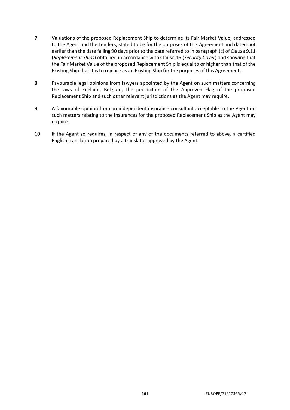 161 EUROPE/71617365v17 7 Valuations of the proposed Replacement Ship to determine its Fair Market Value, addressed to the Agent and the Lenders, stated to be for the purposes of this Agreement and dated not earlier than the date falling 90 days prior to the date referred to in paragraph (c) of Clause 9.11 (Replacement Ships) obtained in accordance with Clause 16 (Security Cover) and showing that the Fair Market Value of the proposed Replacement Ship is equal to or higher than that of the Existing Ship that it is to replace as an Existing Ship for the purposes of this Agreement. 8 Favourable legal opinions from lawyers appointed by the Agent on such matters concerning the laws of England, Belgium, the jurisdiction of the Approved Flag of the proposed Replacement Ship and such other relevant jurisdictions as the Agent may require. 9 A favourable opinion from an independent insurance consultant acceptable to the Agent on such matters relating to the insurances for the proposed Replacement Ship as the Agent may require. 10 If the Agent so requires, in respect of any of the documents referred to above, a certified English translation prepared by a translator approved by the Agent.