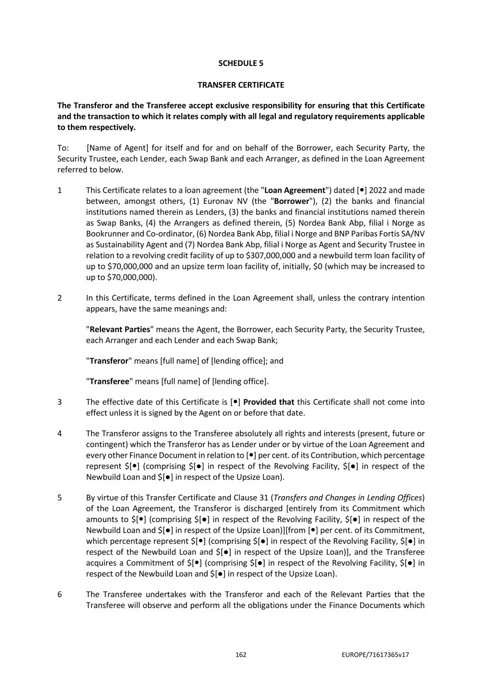 162 EUROPE/71617365v17 SCHEDULE 5 TRANSFER CERTIFICATE The Transferor and the Transferee accept exclusive responsibility for ensuring that this Certificate and the transaction to which it relates comply with all legal and regulatory requirements applicable to them respectively. To: [Name of Agent] for itself and for and on behalf of the Borrower, each Security Party, the Security Trustee, each Lender, each Swap Bank and each Arranger, as defined in the Loan Agreement referred to below. 1 This Certificate relates to a loan agreement (the "Loan Agreement") dated [] 2022 and made between, amongst others, (1) Euronav NV (the "Borrower"), (2) the banks and financial institutions named therein as Lenders, (3) the banks and financial institutions named therein as Swap Banks, (4) the Arrangers as defined therein, (5) Nordea Bank Abp, filial i Norge as Bookrunner and Co-ordinator, (6) Nordea Bank Abp, filial i Norge and BNP Paribas Fortis SA/NV as Sustainability Agent and (7) Nordea Bank Abp, filial i Norge as Agent and Security Trustee in relation to a revolving credit facility of up to $307,000,000 and a newbuild term loan facility of up to $70,000,000 and an upsize term loan facility of, initially, $0 (which may be increased to up to $70,000,000). 2 In this Certificate, terms defined in the Loan Agreement shall, unless the contrary intention appears, have the same meanings and: "Relevant Parties" means the Agent, the Borrower, each Security Party, the Security Trustee, each Arranger and each Lender and each Swap Bank; "Transferor" means [full name] of [lending office]; and "Transferee" means [full name] of [lending office]. 3 The effective date of this Certificate is [] Provided that this Certificate shall not come into effect unless it is signed by the Agent on or before that date. 4 The Transferor assigns to the Transferee absolutely all rights and interests (present, future or contingent) which the Transferor has as Lender under or by virtue of the Loan Agreement and every other Finance Document in relation to [] per cent. of its Contribution, which percentage represent $[] (comprising $[●] in respect of the Revolving Facility, $[●] in respect of the Newbuild Loan and $[●] in respect of the Upsize Loan). 5 By virtue of this Transfer Certificate and Clause 31 (Transfers and Changes in Lending Offices) of the Loan Agreement, the Transferor is discharged [entirely from its Commitment which amounts to $[] (comprising $[●] in respect of the Revolving Facility, $[●] in respect of the Newbuild Loan and $[●] in respect of the Upsize Loan)][from [] per cent. of its Commitment, which percentage represent $[] (comprising $[●] in respect of the Revolving Facility, $[●] in respect of the Newbuild Loan and $[●] in respect of the Upsize Loan)], and the Transferee acquires a Commitment of $[] (comprising $[●] in respect of the Revolving Facility, $[●] in respect of the Newbuild Loan and $[●] in respect of the Upsize Loan). 6 The Transferee undertakes with the Transferor and each of the Relevant Parties that the Transferee will observe and perform all the obligations under the Finance Documents which