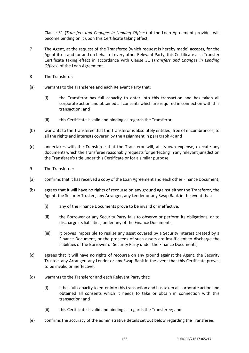163 EUROPE/71617365v17 Clause 31 (Transfers and Changes in Lending Offices) of the Loan Agreement provides will become binding on it upon this Certificate taking effect. 7 The Agent, at the request of the Transferee (which request is hereby made) accepts, for the Agent itself and for and on behalf of every other Relevant Party, this Certificate as a Transfer Certificate taking effect in accordance with Clause 31 (Transfers and Changes in Lending Offices) of the Loan Agreement. 8 The Transferor: (a) warrants to the Transferee and each Relevant Party that: (i) the Transferor has full capacity to enter into this transaction and has taken all corporate action and obtained all consents which are required in connection with this transaction; and (ii) this Certificate is valid and binding as regards the Transferor; (b) warrants to the Transferee that the Transferor is absolutely entitled, free of encumbrances, to all the rights and interests covered by the assignment in paragraph 4; and (c) undertakes with the Transferee that the Transferor will, at its own expense, execute any documents which the Transferee reasonably requests for perfecting in any relevant jurisdiction the Transferee's title under this Certificate or for a similar purpose. 9 The Transferee: (a) confirms that it has received a copy of the Loan Agreement and each other Finance Document; (b) agrees that it will have no rights of recourse on any ground against either the Transferor, the Agent, the Security Trustee, any Arranger, any Lender or any Swap Bank in the event that: (i) any of the Finance Documents prove to be invalid or ineffective, (ii) the Borrower or any Security Party fails to observe or perform its obligations, or to discharge its liabilities, under any of the Finance Documents; (iii) it proves impossible to realise any asset covered by a Security Interest created by a Finance Document, or the proceeds of such assets are insufficient to discharge the liabilities of the Borrower or Security Party under the Finance Documents; (c) agrees that it will have no rights of recourse on any ground against the Agent, the Security Trustee, any Arranger, any Lender or any Swap Bank in the event that this Certificate proves to be invalid or ineffective; (d) warrants to the Transferor and each Relevant Party that: (i) it has full capacity to enter into this transaction and has taken all corporate action and obtained all consents which it needs to take or obtain in connection with this transaction; and (ii) this Certificate is valid and binding as regards the Transferee; and (e) confirms the accuracy of the administrative details set out below regarding the Transferee.