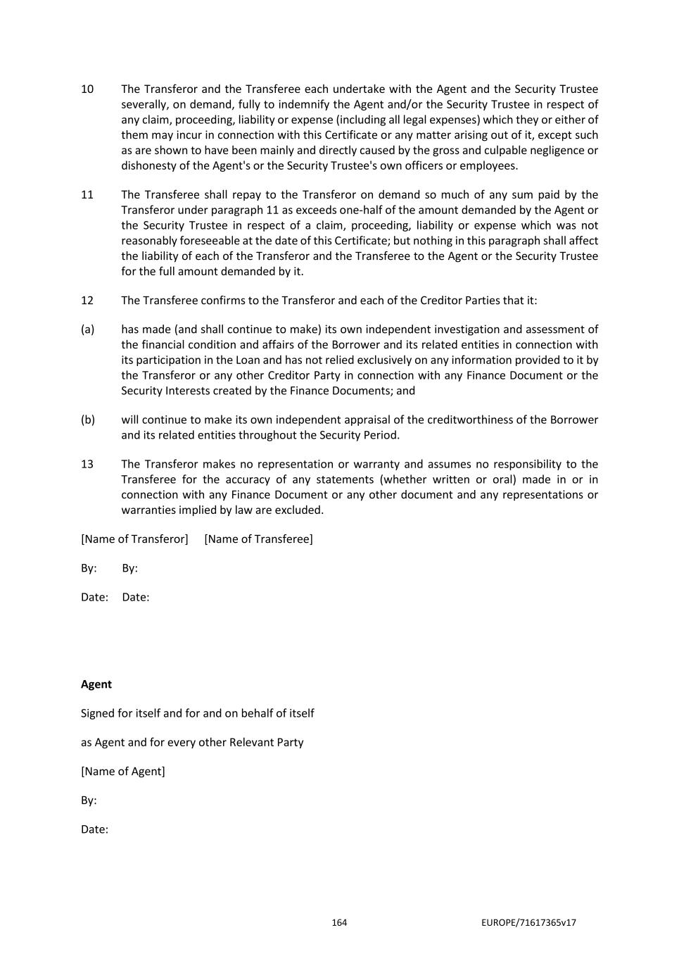 164 EUROPE/71617365v17 10 The Transferor and the Transferee each undertake with the Agent and the Security Trustee severally, on demand, fully to indemnify the Agent and/or the Security Trustee in respect of any claim, proceeding, liability or expense (including all legal expenses) which they or either of them may incur in connection with this Certificate or any matter arising out of it, except such as are shown to have been mainly and directly caused by the gross and culpable negligence or dishonesty of the Agent's or the Security Trustee's own officers or employees. 11 The Transferee shall repay to the Transferor on demand so much of any sum paid by the Transferor under paragraph 11 as exceeds one-half of the amount demanded by the Agent or the Security Trustee in respect of a claim, proceeding, liability or expense which was not reasonably foreseeable at the date of this Certificate; but nothing in this paragraph shall affect the liability of each of the Transferor and the Transferee to the Agent or the Security Trustee for the full amount demanded by it. 12 The Transferee confirms to the Transferor and each of the Creditor Parties that it: (a) has made (and shall continue to make) its own independent investigation and assessment of the financial condition and affairs of the Borrower and its related entities in connection with its participation in the Loan and has not relied exclusively on any information provided to it by the Transferor or any other Creditor Party in connection with any Finance Document or the Security Interests created by the Finance Documents; and (b) will continue to make its own independent appraisal of the creditworthiness of the Borrower and its related entities throughout the Security Period. 13 The Transferor makes no representation or warranty and assumes no responsibility to the Transferee for the accuracy of any statements (whether written or oral) made in or in connection with any Finance Document or any other document and any representations or warranties implied by law are excluded. [Name of Transferor] [Name of Transferee] By: By: Date: Date: Agent Signed for itself and for and on behalf of itself as Agent and for every other Relevant Party [Name of Agent] By: Date: