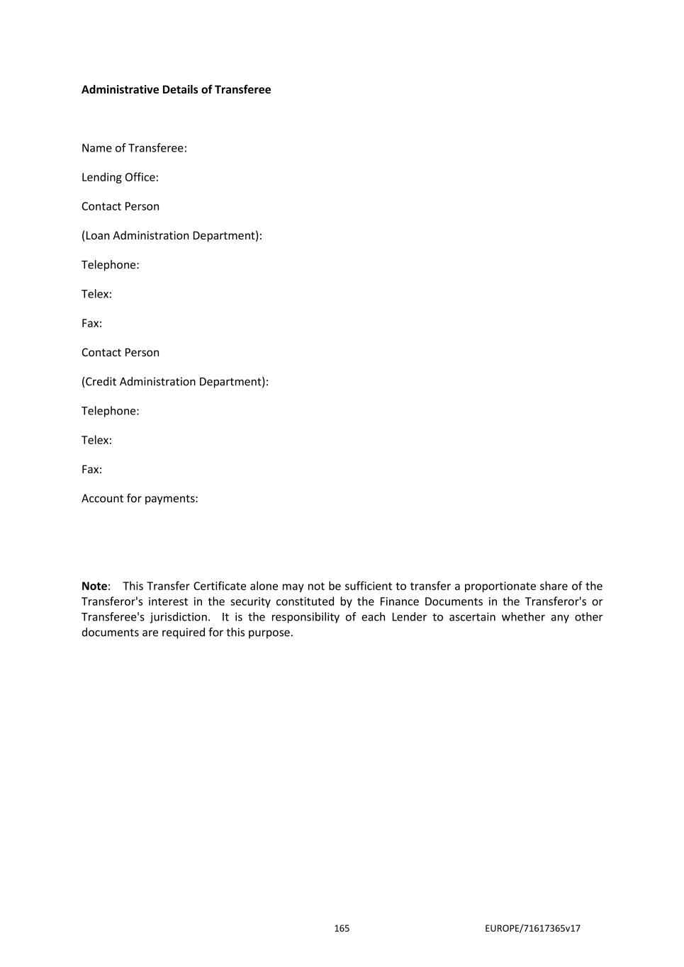 165 EUROPE/71617365v17 Administrative Details of Transferee Name of Transferee: Lending Office: Contact Person (Loan Administration Department): Telephone: Telex: Fax: Contact Person (Credit Administration Department): Telephone: Telex: Fax: Account for payments: Note: This Transfer Certificate alone may not be sufficient to transfer a proportionate share of the Transferor's interest in the security constituted by the Finance Documents in the Transferor's or Transferee's jurisdiction. It is the responsibility of each Lender to ascertain whether any other documents are required for this purpose.