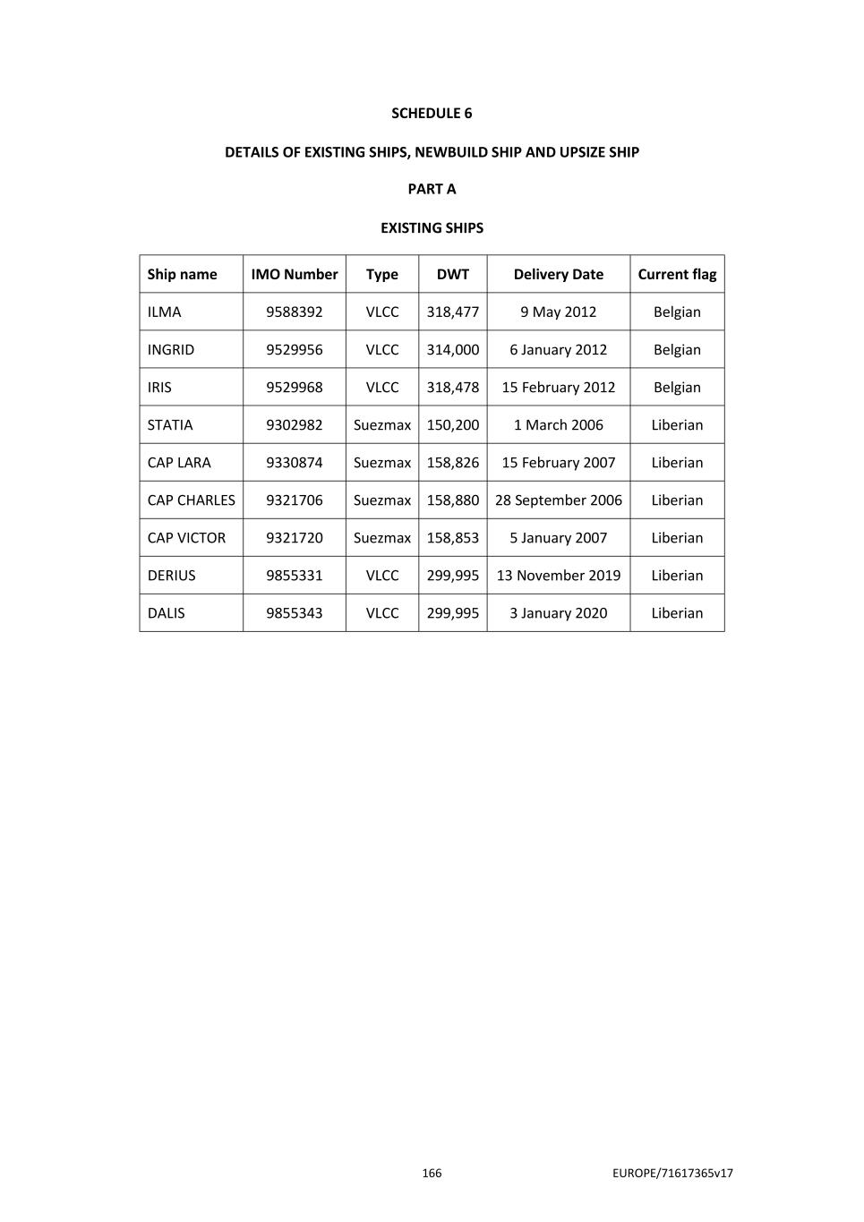 166 EUROPE/71617365v17 SCHEDULE 6 DETAILS OF EXISTING SHIPS, NEWBUILD SHIP AND UPSIZE SHIP PART A EXISTING SHIPS Ship name IMO Number Type DWT Delivery Date Current flag ILMA 9588392 VLCC 318,477 9 May 2012 Belgian INGRID 9529956 VLCC 314,000 6 January 2012 Belgian IRIS 9529968 VLCC 318,478 15 February 2012 Belgian STATIA 9302982 Suezmax 150,200 1 March 2006 Liberian CAP LARA 9330874 Suezmax 158,826 15 February 2007 Liberian CAP CHARLES 9321706 Suezmax 158,880 28 September 2006 Liberian CAP VICTOR 9321720 Suezmax 158,853 5 January 2007 Liberian DERIUS 9855331 VLCC 299,995 13 November 2019 Liberian DALIS 9855343 VLCC 299,995 3 January 2020 Liberian