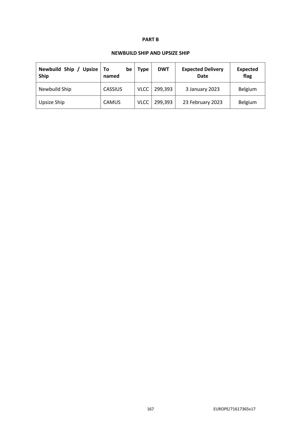 167 EUROPE/71617365v17 PART B NEWBUILD SHIP AND UPSIZE SHIP Newbuild Ship / Upsize Ship To be named Type DWT Expected Delivery Date Expected flag Newbuild Ship CASSIUS VLCC 299,393 3 January 2023 Belgium Upsize Ship CAMUS VLCC 299,393 23 February 2023 Belgium