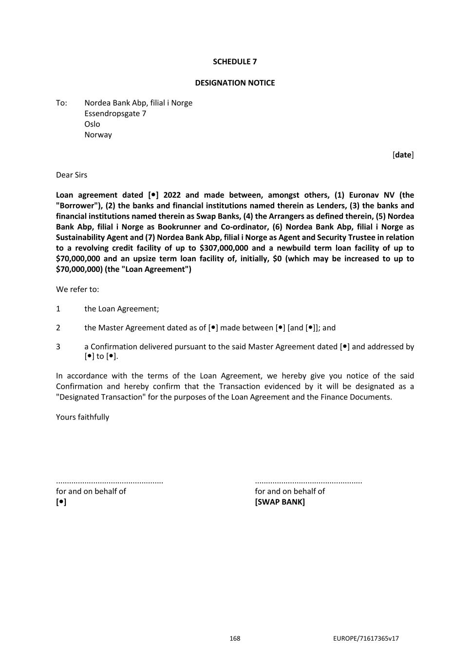 168 EUROPE/71617365v17 SCHEDULE 7 DESIGNATION NOTICE To: Nordea Bank Abp, filial i Norge Essendropsgate 7 Oslo Norway [date] Dear Sirs Loan agreement dated [] 2022 and made between, amongst others, (1) Euronav NV (the "Borrower"), (2) the banks and financial institutions named therein as Lenders, (3) the banks and financial institutions named therein as Swap Banks, (4) the Arrangers as defined therein, (5) Nordea Bank Abp, filial i Norge as Bookrunner and Co-ordinator, (6) Nordea Bank Abp, filial i Norge as Sustainability Agent and (7) Nordea Bank Abp, filial i Norge as Agent and Security Trustee in relation to a revolving credit facility of up to $307,000,000 and a newbuild term loan facility of up to $70,000,000 and an upsize term loan facility of, initially, $0 (which may be increased to up to $70,000,000) (the "Loan Agreement") We refer to: 1 the Loan Agreement; 2 the Master Agreement dated as of [] made between [] [and []]; and 3 a Confirmation delivered pursuant to the said Master Agreement dated [] and addressed by [] to []. In accordance with the terms of the Loan Agreement, we hereby give you notice of the said Confirmation and hereby confirm that the Transaction evidenced by it will be designated as a "Designated Transaction" for the purposes of the Loan Agreement and the Finance Documents. Yours faithfully ................................................. ................................................. for and on behalf of for and on behalf of [] [SWAP BANK]