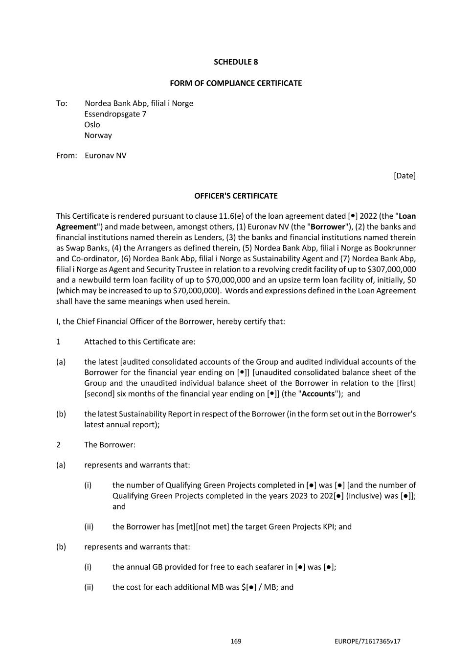169 EUROPE/71617365v17 SCHEDULE 8 FORM OF COMPLIANCE CERTIFICATE To: Nordea Bank Abp, filial i Norge Essendropsgate 7 Oslo Norway From: Euronav NV [Date] OFFICER'S CERTIFICATE This Certificate is rendered pursuant to clause 11.6(e) of the loan agreement dated [] 2022 (the "Loan Agreement") and made between, amongst others, (1) Euronav NV (the "Borrower"), (2) the banks and financial institutions named therein as Lenders, (3) the banks and financial institutions named therein as Swap Banks, (4) the Arrangers as defined therein, (5) Nordea Bank Abp, filial i Norge as Bookrunner and Co-ordinator, (6) Nordea Bank Abp, filial i Norge as Sustainability Agent and (7) Nordea Bank Abp, filial i Norge as Agent and Security Trustee in relation to a revolving credit facility of up to $307,000,000 and a newbuild term loan facility of up to $70,000,000 and an upsize term loan facility of, initially, $0 (which may be increased to up to $70,000,000). Words and expressions defined in the Loan Agreement shall have the same meanings when used herein. I, the Chief Financial Officer of the Borrower, hereby certify that: 1 Attached to this Certificate are: (a) the latest [audited consolidated accounts of the Group and audited individual accounts of the Borrower for the financial year ending on []] [unaudited consolidated balance sheet of the Group and the unaudited individual balance sheet of the Borrower in relation to the [first] [second] six months of the financial year ending on []] (the "Accounts"); and (b) the latest Sustainability Report in respect of the Borrower (in the form set out in the Borrower's latest annual report); 2 The Borrower: (a) represents and warrants that: (i) the number of Qualifying Green Projects completed in [●] was [●] [and the number of Qualifying Green Projects completed in the years 2023 to 202[●] (inclusive) was [●]]; and (ii) the Borrower has [met][not met] the target Green Projects KPI; and (b) represents and warrants that: (i) the annual GB provided for free to each seafarer in [●] was [●]; (ii) the cost for each additional MB was $[●] / MB; and
