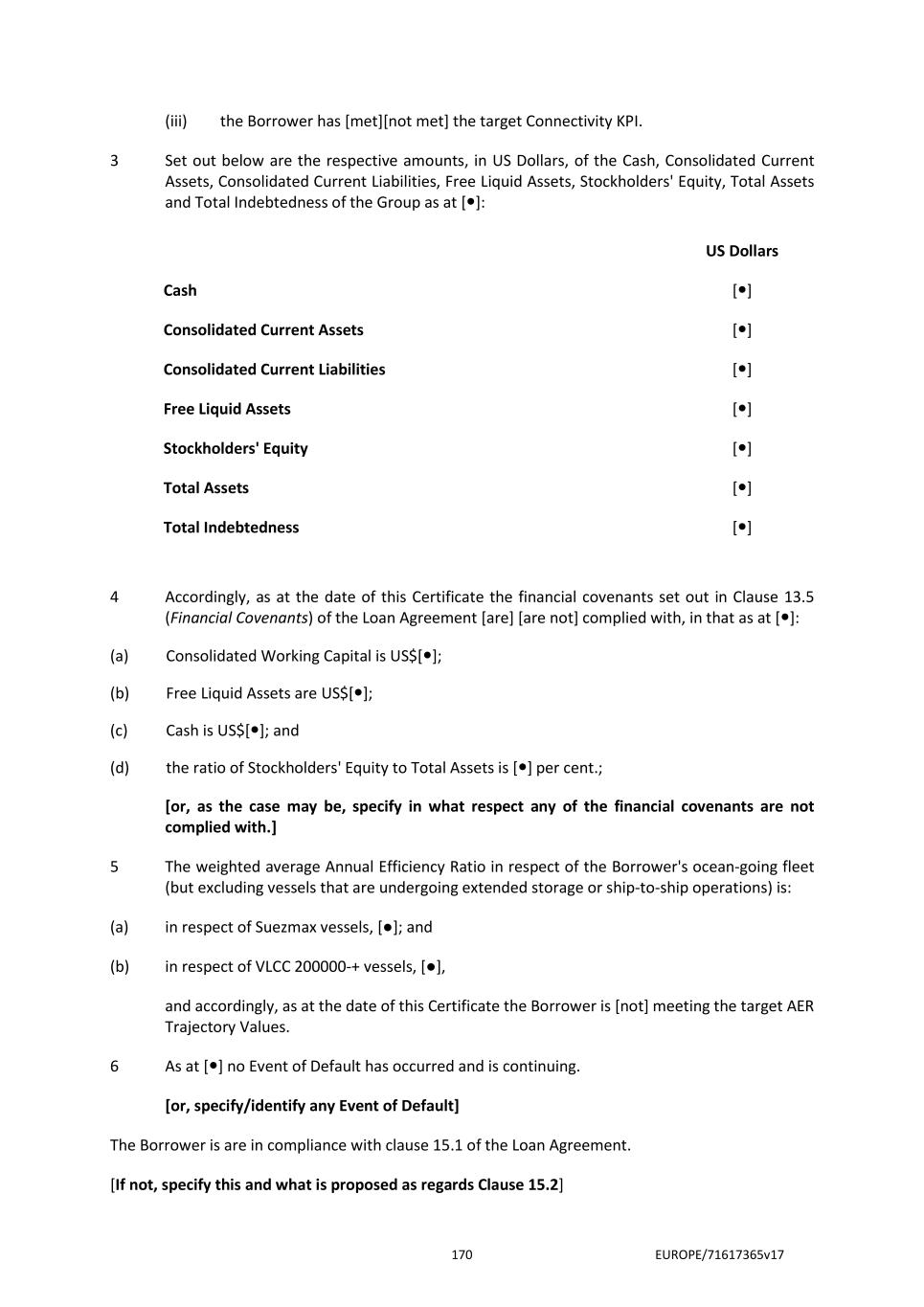 170 EUROPE/71617365v17 (iii) the Borrower has [met][not met] the target Connectivity KPI. 3 Set out below are the respective amounts, in US Dollars, of the Cash, Consolidated Current Assets, Consolidated Current Liabilities, Free Liquid Assets, Stockholders' Equity, Total Assets and Total Indebtedness of the Group as at []: US Dollars Cash [] Consolidated Current Assets [] Consolidated Current Liabilities [] Free Liquid Assets [] Stockholders' Equity [] Total Assets [] Total Indebtedness [] 4 Accordingly, as at the date of this Certificate the financial covenants set out in Clause 13.5 (Financial Covenants) of the Loan Agreement [are] [are not] complied with, in that as at []: (a) Consolidated Working Capital is US$[]; (b) Free Liquid Assets are US$[]; (c) Cash is US$[]; and (d) the ratio of Stockholders' Equity to Total Assets is [] per cent.; [or, as the case may be, specify in what respect any of the financial covenants are not complied with.] 5 The weighted average Annual Efficiency Ratio in respect of the Borrower's ocean-going fleet (but excluding vessels that are undergoing extended storage or ship-to-ship operations) is: (a) in respect of Suezmax vessels, [●]; and (b) in respect of VLCC 200000-+ vessels, [●], and accordingly, as at the date of this Certificate the Borrower is [not] meeting the target AER Trajectory Values. 6 As at [] no Event of Default has occurred and is continuing. [or, specify/identify any Event of Default] The Borrower is are in compliance with clause 15.1 of the Loan Agreement. [If not, specify this and what is proposed as regards Clause 15.2]