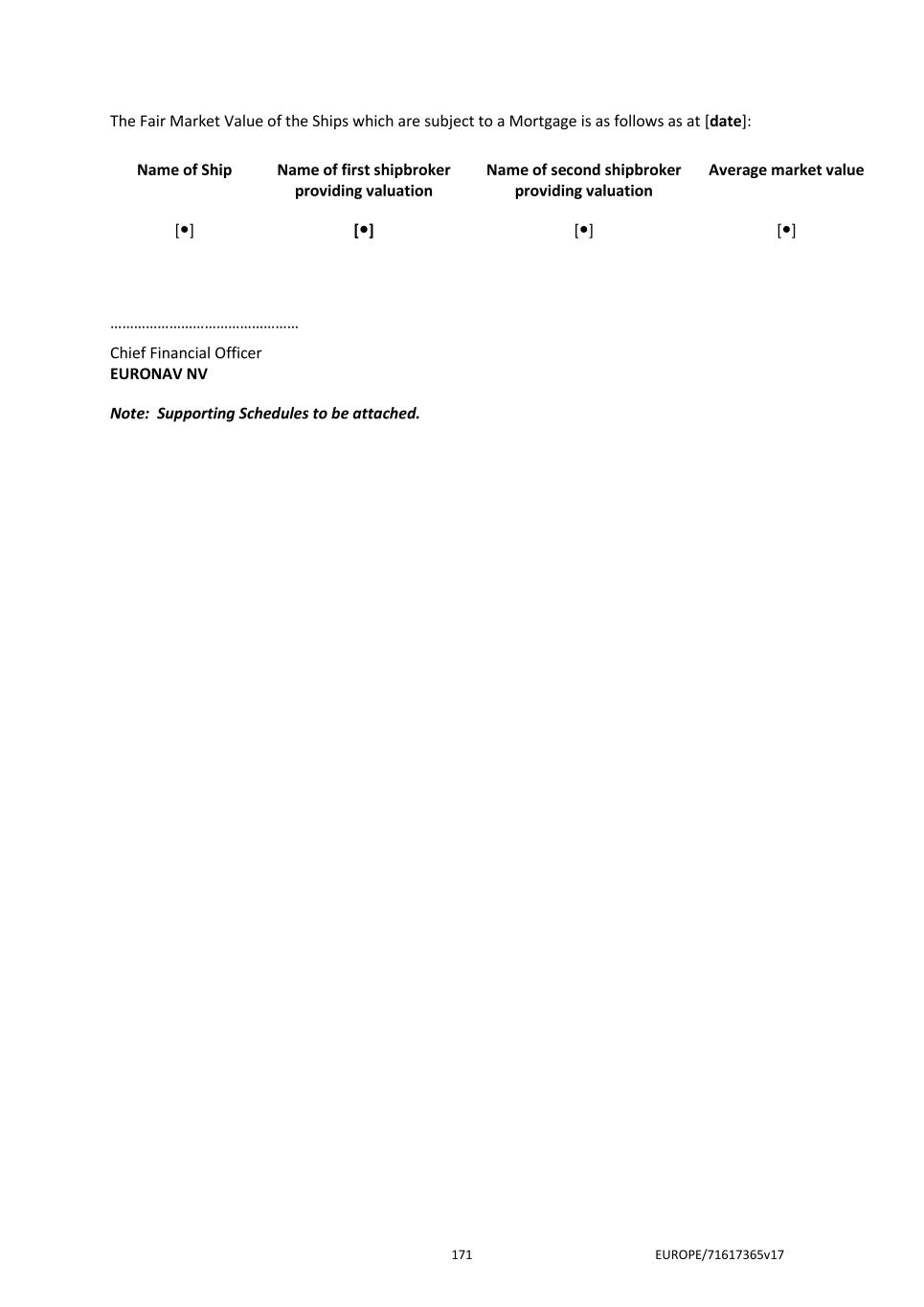 171 EUROPE/71617365v17 The Fair Market Value of the Ships which are subject to a Mortgage is as follows as at [date]: Name of Ship Name of first shipbroker providing valuation Name of second shipbroker providing valuation Average market value [] [] [] [] ………………………………………… Chief Financial Officer EURONAV NV Note: Supporting Schedules to be attached.