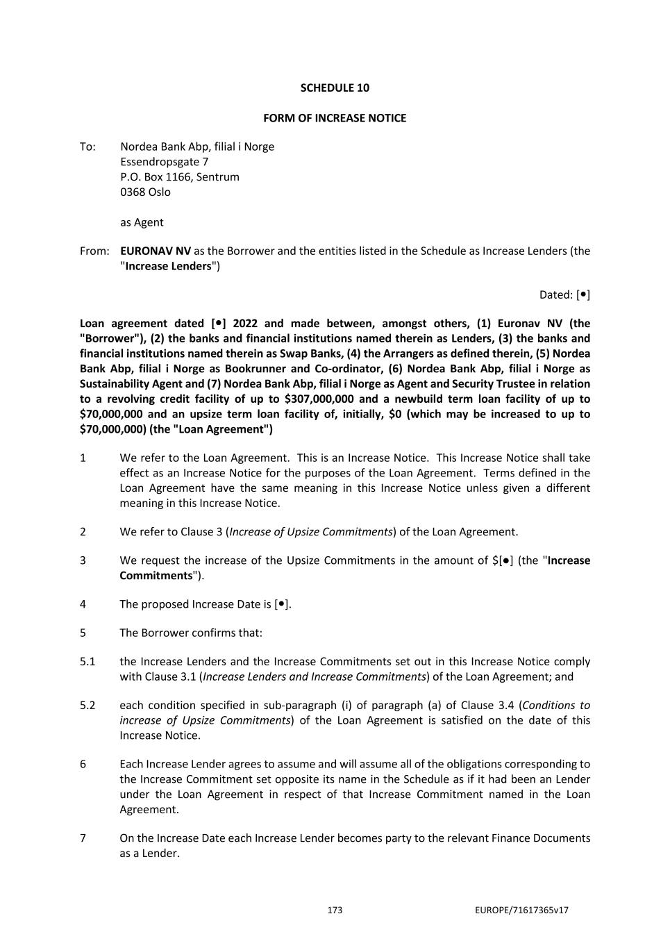173 EUROPE/71617365v17 SCHEDULE 10 FORM OF INCREASE NOTICE To: Nordea Bank Abp, filial i Norge Essendropsgate 7 P.O. Box 1166, Sentrum 0368 Oslo as Agent From: EURONAV NV as the Borrower and the entities listed in the Schedule as Increase Lenders (the "Increase Lenders") Dated: [] Loan agreement dated [] 2022 and made between, amongst others, (1) Euronav NV (the "Borrower"), (2) the banks and financial institutions named therein as Lenders, (3) the banks and financial institutions named therein as Swap Banks, (4) the Arrangers as defined therein, (5) Nordea Bank Abp, filial i Norge as Bookrunner and Co-ordinator, (6) Nordea Bank Abp, filial i Norge as Sustainability Agent and (7) Nordea Bank Abp, filial i Norge as Agent and Security Trustee in relation to a revolving credit facility of up to $307,000,000 and a newbuild term loan facility of up to $70,000,000 and an upsize term loan facility of, initially, $0 (which may be increased to up to $70,000,000) (the "Loan Agreement") 1 We refer to the Loan Agreement. This is an Increase Notice. This Increase Notice shall take effect as an Increase Notice for the purposes of the Loan Agreement. Terms defined in the Loan Agreement have the same meaning in this Increase Notice unless given a different meaning in this Increase Notice. 2 We refer to Clause 3 (Increase of Upsize Commitments) of the Loan Agreement. 3 We request the increase of the Upsize Commitments in the amount of $[●] (the "Increase Commitments"). 4 The proposed Increase Date is []. 5 The Borrower confirms that: 5.1 the Increase Lenders and the Increase Commitments set out in this Increase Notice comply with Clause 3.1 (Increase Lenders and Increase Commitments) of the Loan Agreement; and 5.2 each condition specified in sub-paragraph (i) of paragraph (a) of Clause 3.4 (Conditions to increase of Upsize Commitments) of the Loan Agreement is satisfied on the date of this Increase Notice. 6 Each Increase Lender agrees to assume and will assume all of the obligations corresponding to the Increase Commitment set opposite its name in the Schedule as if it had been an Lender under the Loan Agreement in respect of that Increase Commitment named in the Loan Agreement. 7 On the Increase Date each Increase Lender becomes party to the relevant Finance Documents as a Lender.