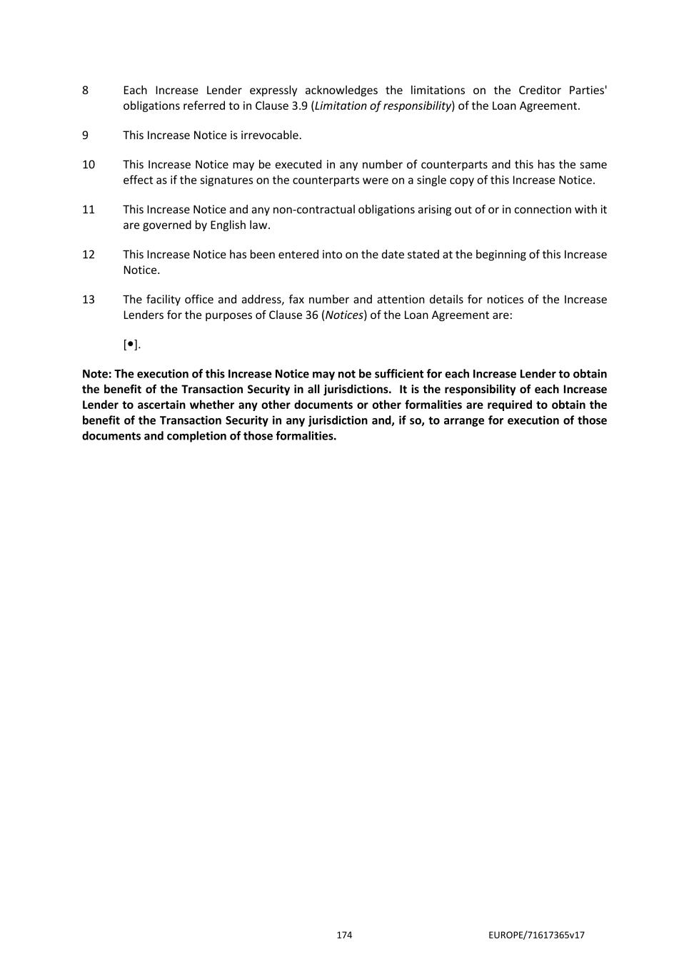 174 EUROPE/71617365v17 8 Each Increase Lender expressly acknowledges the limitations on the Creditor Parties' obligations referred to in Clause 3.9 (Limitation of responsibility) of the Loan Agreement. 9 This Increase Notice is irrevocable. 10 This Increase Notice may be executed in any number of counterparts and this has the same effect as if the signatures on the counterparts were on a single copy of this Increase Notice. 11 This Increase Notice and any non-contractual obligations arising out of or in connection with it are governed by English law. 12 This Increase Notice has been entered into on the date stated at the beginning of this Increase Notice. 13 The facility office and address, fax number and attention details for notices of the Increase Lenders for the purposes of Clause 36 (Notices) of the Loan Agreement are: []. Note: The execution of this Increase Notice may not be sufficient for each Increase Lender to obtain the benefit of the Transaction Security in all jurisdictions. It is the responsibility of each Increase Lender to ascertain whether any other documents or other formalities are required to obtain the benefit of the Transaction Security in any jurisdiction and, if so, to arrange for execution of those documents and completion of those formalities.