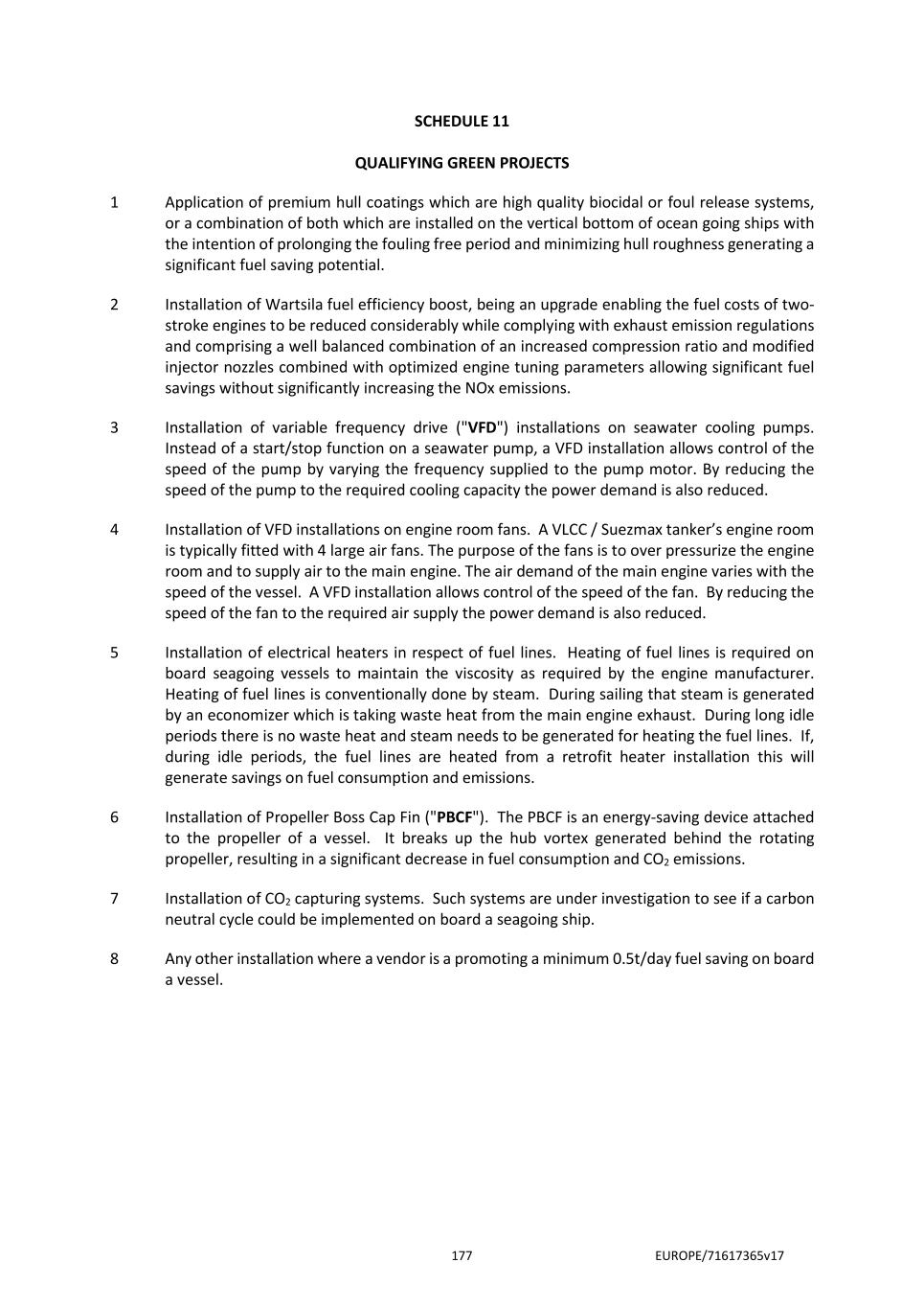 177 EUROPE/71617365v17 SCHEDULE 11 QUALIFYING GREEN PROJECTS 1 Application of premium hull coatings which are high quality biocidal or foul release systems, or a combination of both which are installed on the vertical bottom of ocean going ships with the intention of prolonging the fouling free period and minimizing hull roughness generating a significant fuel saving potential. 2 Installation of Wartsila fuel efficiency boost, being an upgrade enabling the fuel costs of two- stroke engines to be reduced considerably while complying with exhaust emission regulations and comprising a well balanced combination of an increased compression ratio and modified injector nozzles combined with optimized engine tuning parameters allowing significant fuel savings without significantly increasing the NOx emissions. 3 Installation of variable frequency drive ("VFD") installations on seawater cooling pumps. Instead of a start/stop function on a seawater pump, a VFD installation allows control of the speed of the pump by varying the frequency supplied to the pump motor. By reducing the speed of the pump to the required cooling capacity the power demand is also reduced. 4 Installation of VFD installations on engine room fans. A VLCC / Suezmax tanker’s engine room is typically fitted with 4 large air fans. The purpose of the fans is to over pressurize the engine room and to supply air to the main engine. The air demand of the main engine varies with the speed of the vessel. A VFD installation allows control of the speed of the fan. By reducing the speed of the fan to the required air supply the power demand is also reduced. 5 Installation of electrical heaters in respect of fuel lines. Heating of fuel lines is required on board seagoing vessels to maintain the viscosity as required by the engine manufacturer. Heating of fuel lines is conventionally done by steam. During sailing that steam is generated by an economizer which is taking waste heat from the main engine exhaust. During long idle periods there is no waste heat and steam needs to be generated for heating the fuel lines. If, during idle periods, the fuel lines are heated from a retrofit heater installation this will generate savings on fuel consumption and emissions. 6 Installation of Propeller Boss Cap Fin ("PBCF"). The PBCF is an energy-saving device attached to the propeller of a vessel. It breaks up the hub vortex generated behind the rotating propeller, resulting in a significant decrease in fuel consumption and CO2 emissions. 7 Installation of CO2 capturing systems. Such systems are under investigation to see if a carbon neutral cycle could be implemented on board a seagoing ship. 8 Any other installation where a vendor is a promoting a minimum 0.5t/day fuel saving on board a vessel.