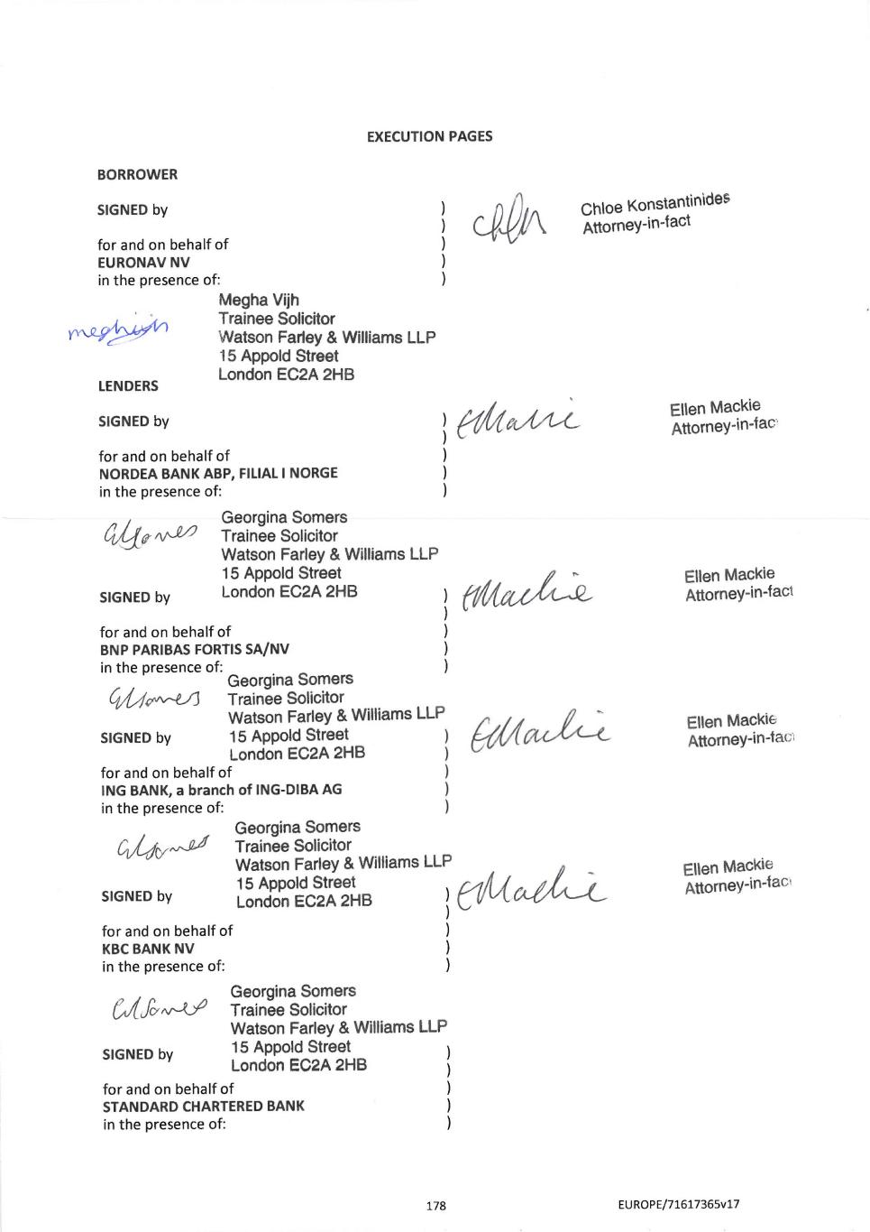 EXECUTION PAGES BORROWER ١/ Chloe Konstantinides Attomey-in-faC SIGNED by ) for and on behalf of EURONAV NV in the presence of- ) ) ) Megha Vijh Trainee Solicitor Watson Farley & Williams LLP 15 Appold Street London EC2A 2HB LENDERS Ellen Mackie Attorney-in-facSIGNED by for and on behalf of NORDEA BANK ABP, FILIAL I NORGE in the presence of- ) Georgina Somers Trainee Solicitor Watson Farley & Williams LLP 15 Appold Street London EC2A 2HB 0صاأ Ellen Mackie Attorney-in-factSIGNED by for and on behalf of ) BNP PARIBAS FORTIS SA/NV In the presence of: Georgina Somers Watson Farley & Williams LLP SIGNED by 15 Appold Street ١ London EC2A 2HB j Ellen Mackife Attorney-in-tac', for and on behalf of ING BANK, a branch of ING-DIBA AG in the presence of: ا ) Georgina Somers Trainee Solicitor Watson Farley & Williams LLP 15 Appold Street London EC2A 2HB سمع Ellen Mackie Attorney-in-tac.؛ SIGNED by ) for and on behalf of KBC BANK NV in the presence of: ) Georgina Somers Trainee Solicitor Watson Farley & Williams LLP 15 Appold Street London EC2A 2HB a Jo سرم )SIGNED by ) for and on behalf of STANDARD CHARTERED BANK in the presence of: EUROPE/71617365V17178