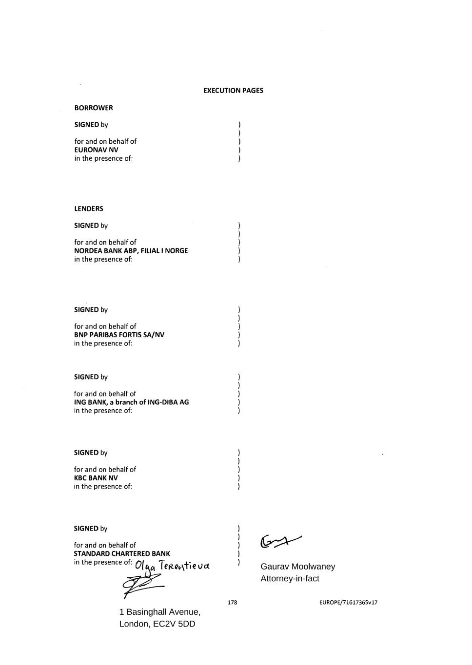 EXECUTION PAGES BORROWER SIGNED by for and on behalf of EURONAV NV in the presence of: LENDERS SIGNED by for and on behalf of NORDEA BANK ABP, FILIAL I NORGE in the presence of: SIGNED by for and on behalf of BNP PARIBAS FORTIS SA/NV in the presence of: SIGNED by for and on behalf of ING BANK, a branch of ING-DIBA AG in the presence of: SIGNED by for and on behalf of KBC BANK NV in the presence of: SIGNED by for and on behalf of STANDARD CHARTERED BANK in the presence of: of t TeR mil R t) ot 178 EUROPE/71617365v17 Gaurav Moolwaney Attorney-in-fact 1 Basinghall Avenue, London, EC2V 5DD