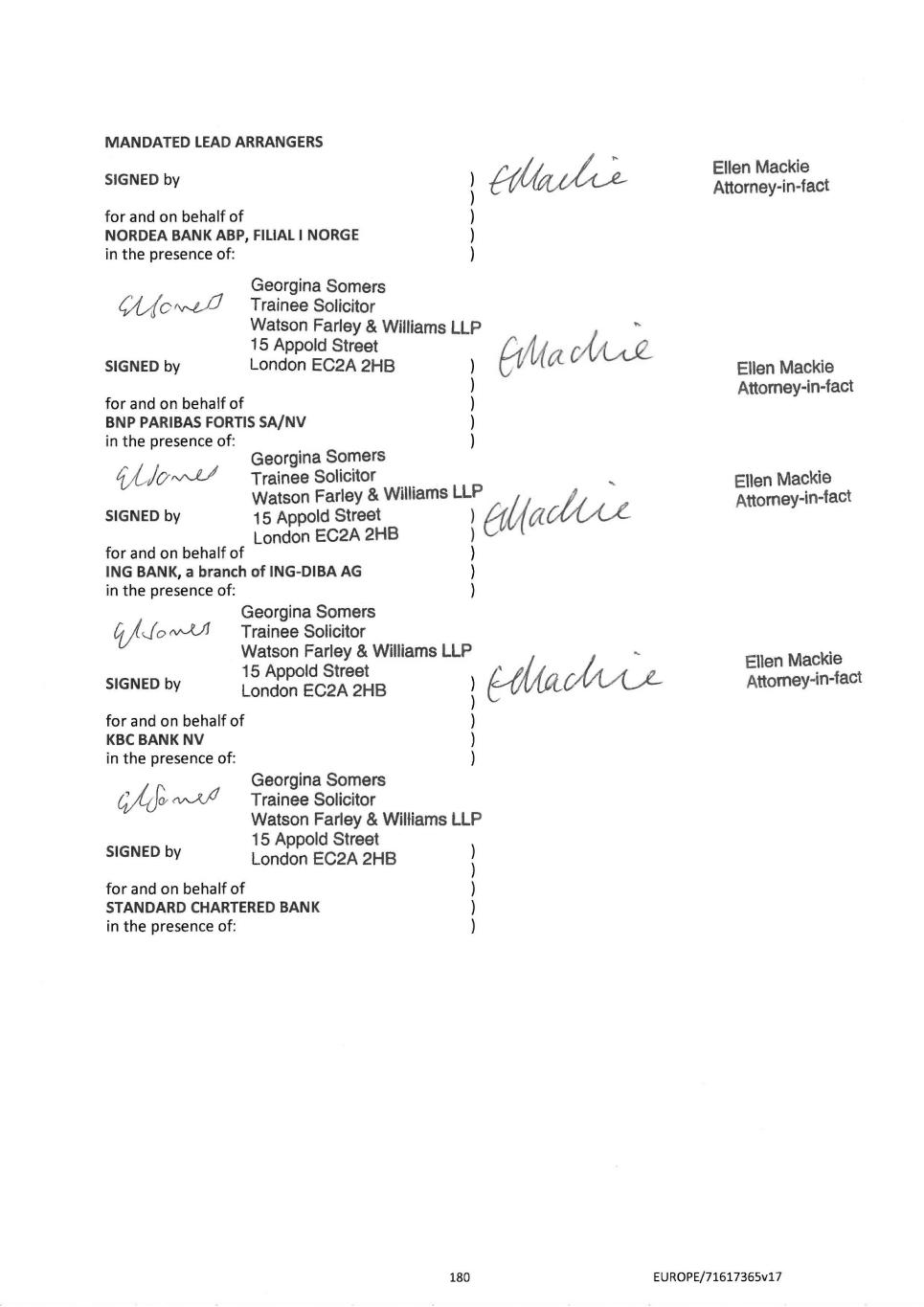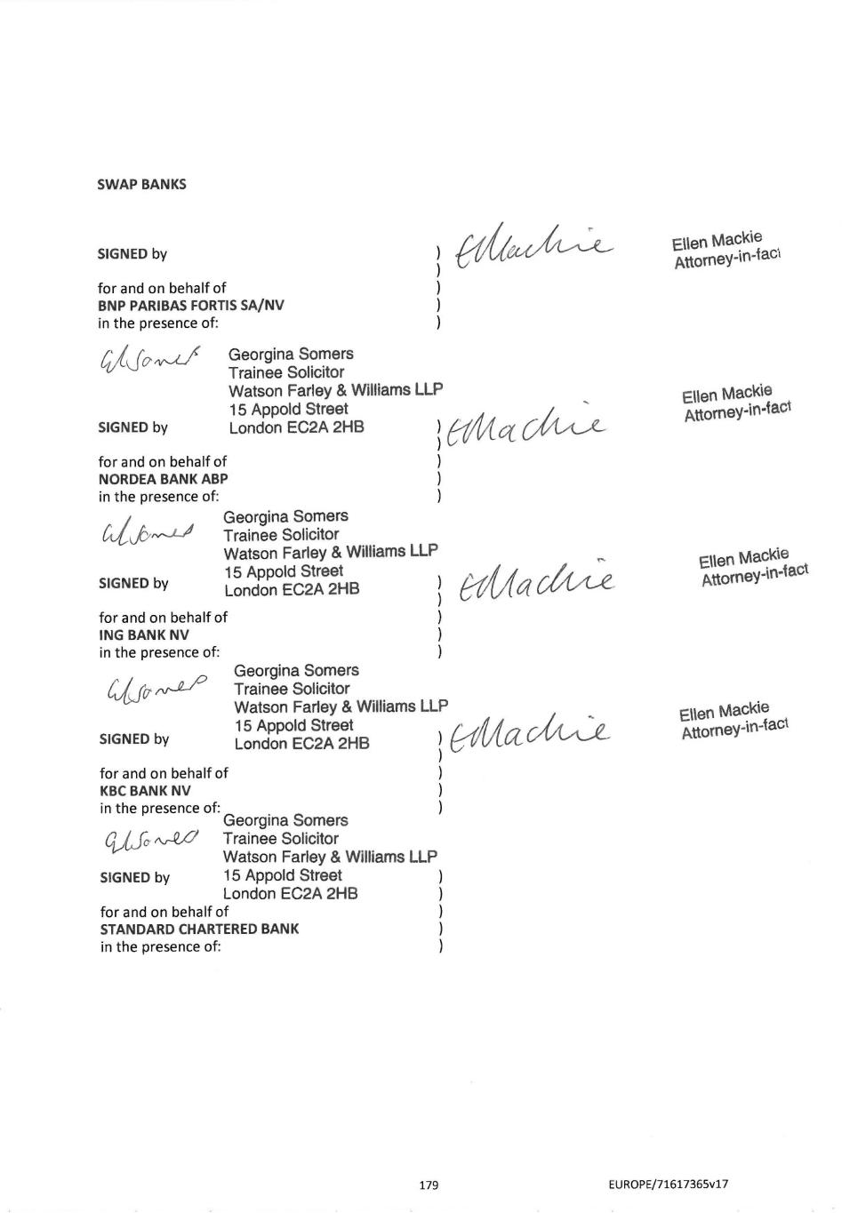 SWAP BANKS EHen Mackie )SIGNED by )for and on behalf of BNP PARIBAS FORTIS rNV in the presence of: Georgina Somers 0 ٧ Trainee Solicitor Watson Farley & Williams LLP 15 Appold Street London EC2A 2HB ٥^١ )SIGNED by L· ) for and on behalf of NORDEA BANK ABP in the presence of: ) Georgina Somers Trainee Solicitor Watson Farley & Williams LLP 15 Appold Street London EC2A 2HB ؛ ٥^٥SIGNED by a for and on behalf of ING BANK NV in the presence of: ) Georgina Somers Trainee Solicitor Watson Farley & Williams LLP 15 Appold Street London EC2A 2HB ) Ellen Mackie ١ SIGNED by for and on behalf of KBC BANK NV in the presence of: ) Georgina Somers Trainee Solicitor Watson Farley & Williams LLP 15 Appold Street London EC2A 2HB SIGNED by ) for and on behalf of STANDARD CHARTERED BANK in the presence of: ) EUR0PE/71617365vl7179
