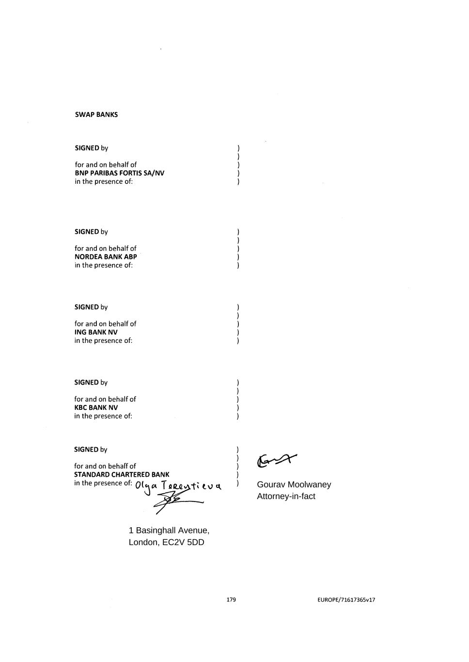 SWAP BANKS SIGNED by for and on behalf of BNP PARIBAS FORTIS SA/NV in the presence of: SIGNED by for and on behalf of NORDEA BANK ABP in the presence of: SIGNED by for and on behalf of ING BANK NV in the presence of: SIGNED by for and on behalf of KBC BANK NV in the presence of: SIGNED by for and on behalf of STANDARD CHARTERED BANK in the presence of: 0(304. T ote 179 EUROPE/71617365v17 Gourav Moolwaney Attorney-in-fact 1 Basinghall Avenue, London, EC2V 5DD