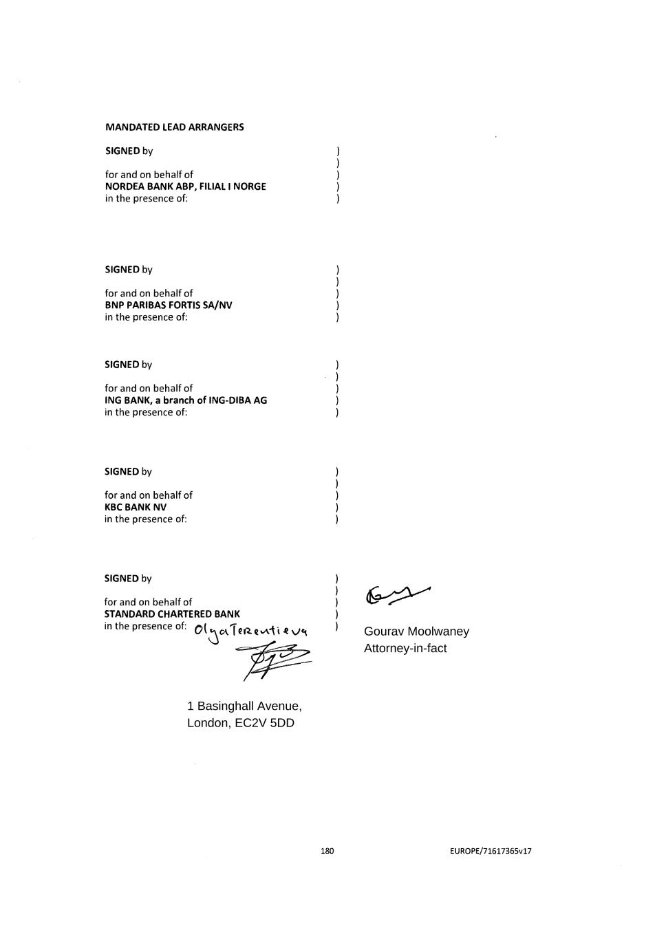 MANDATED LEAD ARRANGERS SIGNED by for and on behalf of NORDEA BANK ABP, FILIAL I NORGE in the presence of: SIGNED by for and on behalf of BNP PARIBAS FORTIS SA/NV in the presence of: SIGNED by for and on behalf of ING BANK, a branch of ING-DIBA AG in the presence of: SIGNED by for and on behalf of KBC BANK NV in the presence of: SIGNED by for and on behalf of STANDARD CHARTERED BANK in the presence of: ot a i elle,,vti ,e vci 180 EUROPE/71617365v17 Gourav Moolwaney Attorney-in-fact 1 Basinghall Avenue, London, EC2V 5DD
