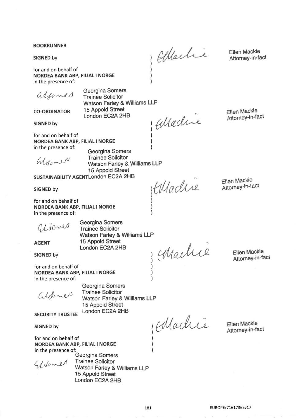 BOOKRUNNER (^{McJajl Ellen Mackle Attorney-ln-fact)SIGNED by ) for and on behalf of NORDEA BANK ABP, FILIAL I NORGE in the presence of: ) ) Georgina Somers Trainee Solicitor Watson Farley & Williams LLP 15 Appold Street London EC2A 2HB /\A/jj 6اى4ه Ellen Mackle Attorney-in-tact CO-ORDINATOR SIGNED by(الرشءص ) for and on behalf of NORDEA BANK ABP, FILIAL I NORGE in the presence of: ) Georgina Somers Trainee Solicitor Watson Farley & Williams LLP 15 Appold Street SUSTAINABILITY AGENTlondon EC2A 2HB Ellen Mackie Attorney-ln-tact SIGNED by for and on behalf of NORDEA BANK ABP, FILIAL I NORGE in the presence of: ) ) Georgina Somers Trainee Solicitor Watson Farley & Williams LLP 15 Appold Street London EC2A 2HB للسءس AGENT Ellen Mackie Attorney-in-factCoSIGNED by ) for and on behalf of NORDEA BANK ABP, FILIAL I NORGE in the presence of: ) Georgina Somers Trainee Solicitor Watson Farley & Williams LLP 15 Appold Street London EC2A 2HBSECURITY TRUSTEE Ellen Mackie Attorney-in-factCLSIGNED by )for and on behalf of )NORDEA BANK ABP, FILIAL I NORGE in the presence of: Georgina Somers Ç¿(fc■ *ajJ Farley0ئ Williams LLP 15 Appold Street London EC2A 2HB EUROPE/71617365vl7181