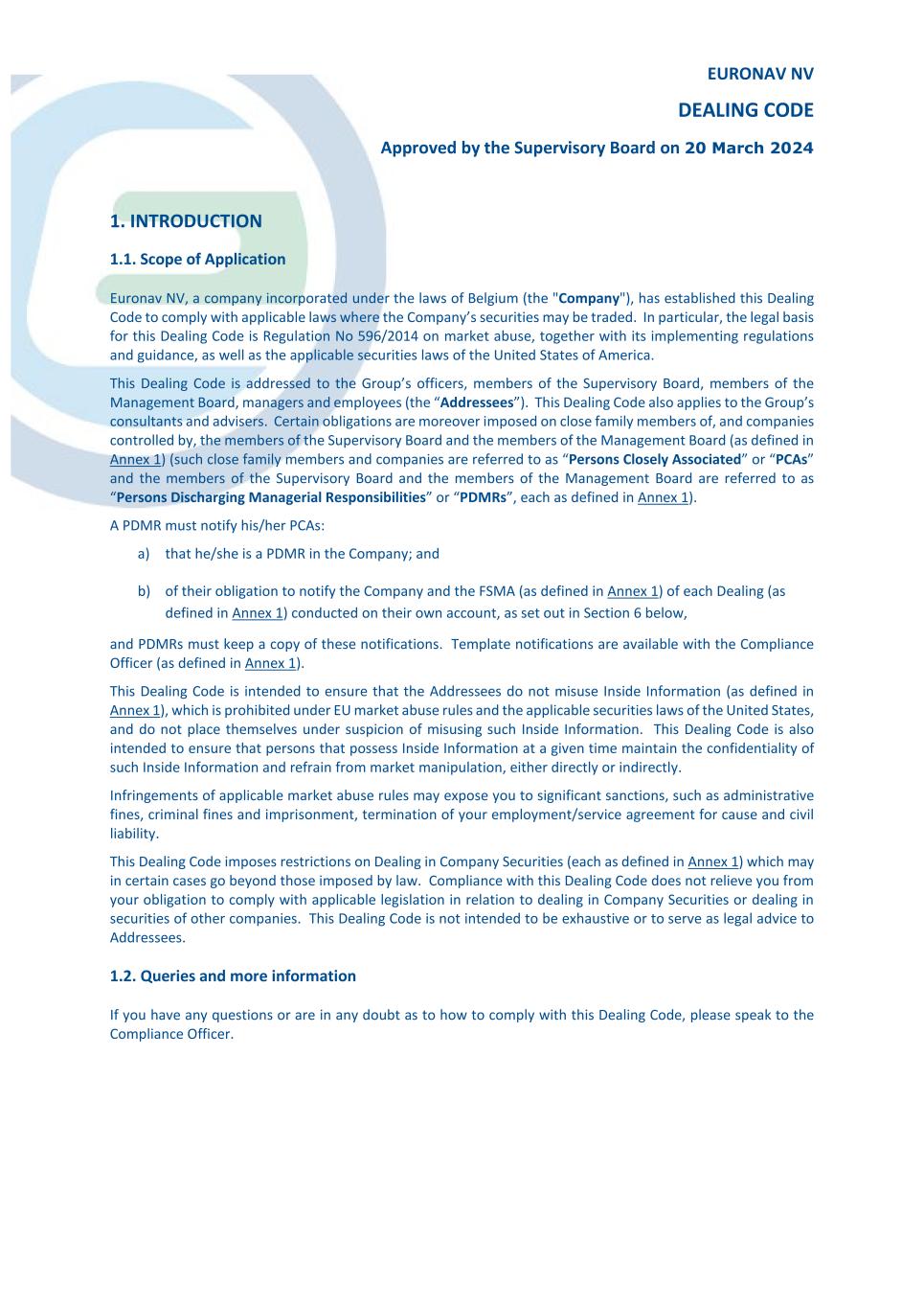EURONAV NV DEALING CODE Approved by the Supervisory Board on 20 March 2024 1. INTRODUCTION 1.1. Scope of Application Euronav NV, a company incorporated under the laws of Belgium (the "Company"), has established this Dealing Code to comply with applicable laws where the Company’s securities may be traded. In particular, the legal basis for this Dealing Code is Regulation No 596/2014 on market abuse, together with its implementing regulations and guidance, as well as the applicable securities laws of the United States of America. This Dealing Code is addressed to the Group’s officers, members of the Supervisory Board, members of the Management Board, managers and employees (the “Addressees”). This Dealing Code also applies to the Group’s consultants and advisers. Certain obligations are moreover imposed on close family members of, and companies controlled by, the members of the Supervisory Board and the members of the Management Board (as defined in Annex 1) (such close family members and companies are referred to as “Persons Closely Associated” or “PCAs” and the members of the Supervisory Board and the members of the Management Board are referred to as “Persons Discharging Managerial Responsibilities” or “PDMRs”, each as defined in Annex 1). A PDMR must notify his/her PCAs: a) that he/she is a PDMR in the Company; and b) of their obligation to notify the Company and the FSMA (as defined in Annex 1) of each Dealing (as defined in Annex 1) conducted on their own account, as set out in Section 6 below, and PDMRs must keep a copy of these notifications. Template notifications are available with the Compliance Officer (as defined in Annex 1). This Dealing Code is intended to ensure that the Addressees do not misuse Inside Information (as defined in Annex 1), which is prohibited under EU market abuse rules and the applicable securities laws of the United States, and do not place themselves under suspicion of misusing such Inside Information. This Dealing Code is also intended to ensure that persons that possess Inside Information at a given time maintain the confidentiality of such Inside Information and refrain from market manipulation, either directly or indirectly. Infringements of applicable market abuse rules may expose you to significant sanctions, such as administrative fines, criminal fines and imprisonment, termination of your employment/service agreement for cause and civil liability. This Dealing Code imposes restrictions on Dealing in Company Securities (each as defined in Annex 1) which may in certain cases go beyond those imposed by law. Compliance with this Dealing Code does not relieve you from your obligation to comply with applicable legislation in relation to dealing in Company Securities or dealing in securities of other companies. This Dealing Code is not intended to be exhaustive or to serve as legal advice to Addressees. 1.2. Queries and more information If you have any questions or are in any doubt as to how to comply with this Dealing Code, please speak to the Compliance Officer.